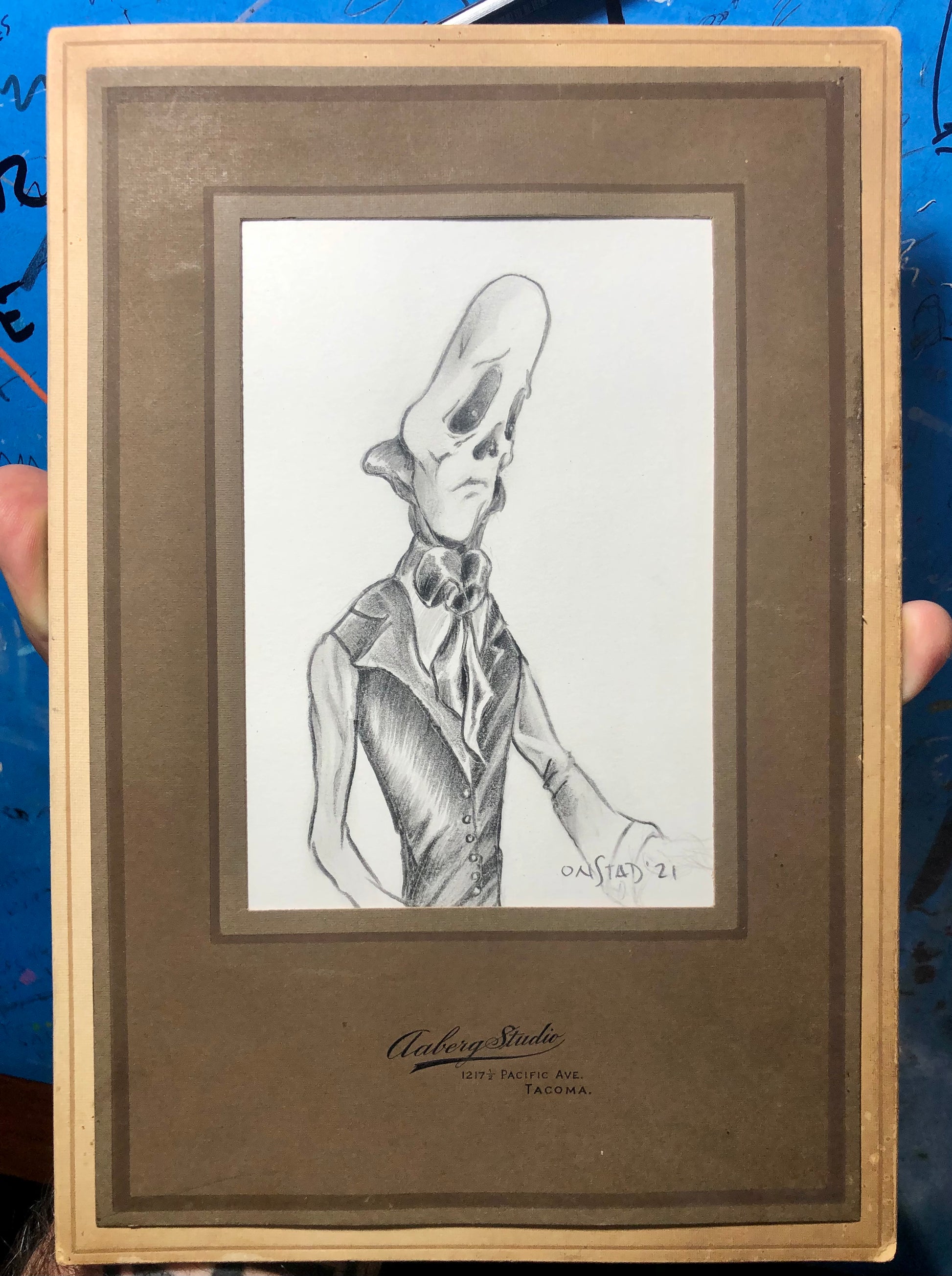 Cartilage Head briefly sat for the Aaberg Studio, Tacoma, WA. More details are not known. It is not even certain that he was sitting; he wished to keep this unclear. pencils in vintage paper frame. Overall measurements 6 5/8" x 9 5/8".