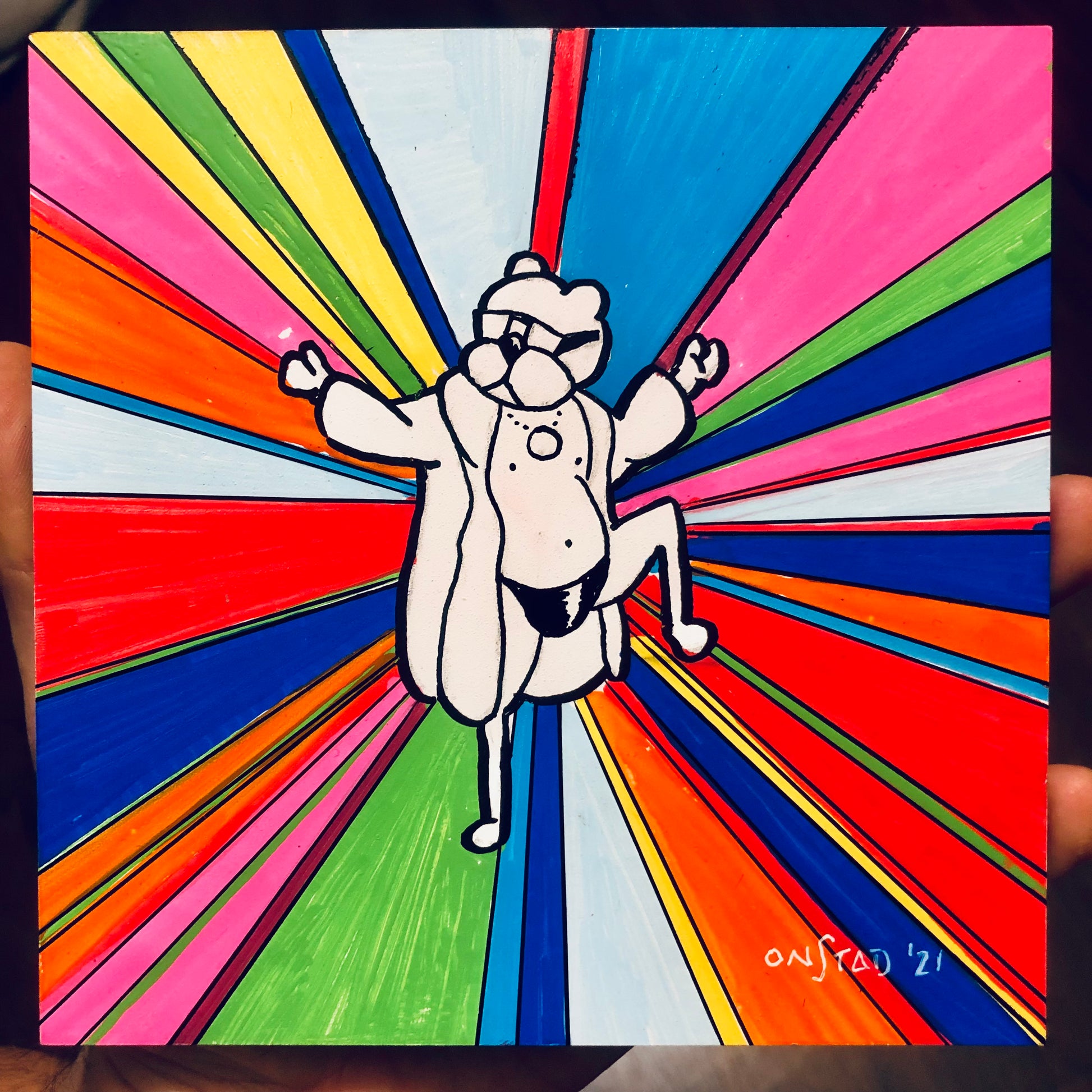 Using sophisticated and highly sensitive government equipment, we were finally able to capture imagery of the cosmic energy that is released when Ray dances to Africa by Toto. The results explain the inexorable draw of the timeless pleasure-portal his dancing creates. 6" square, oil pen on sealed bright white gesso board, 1/8" thick.