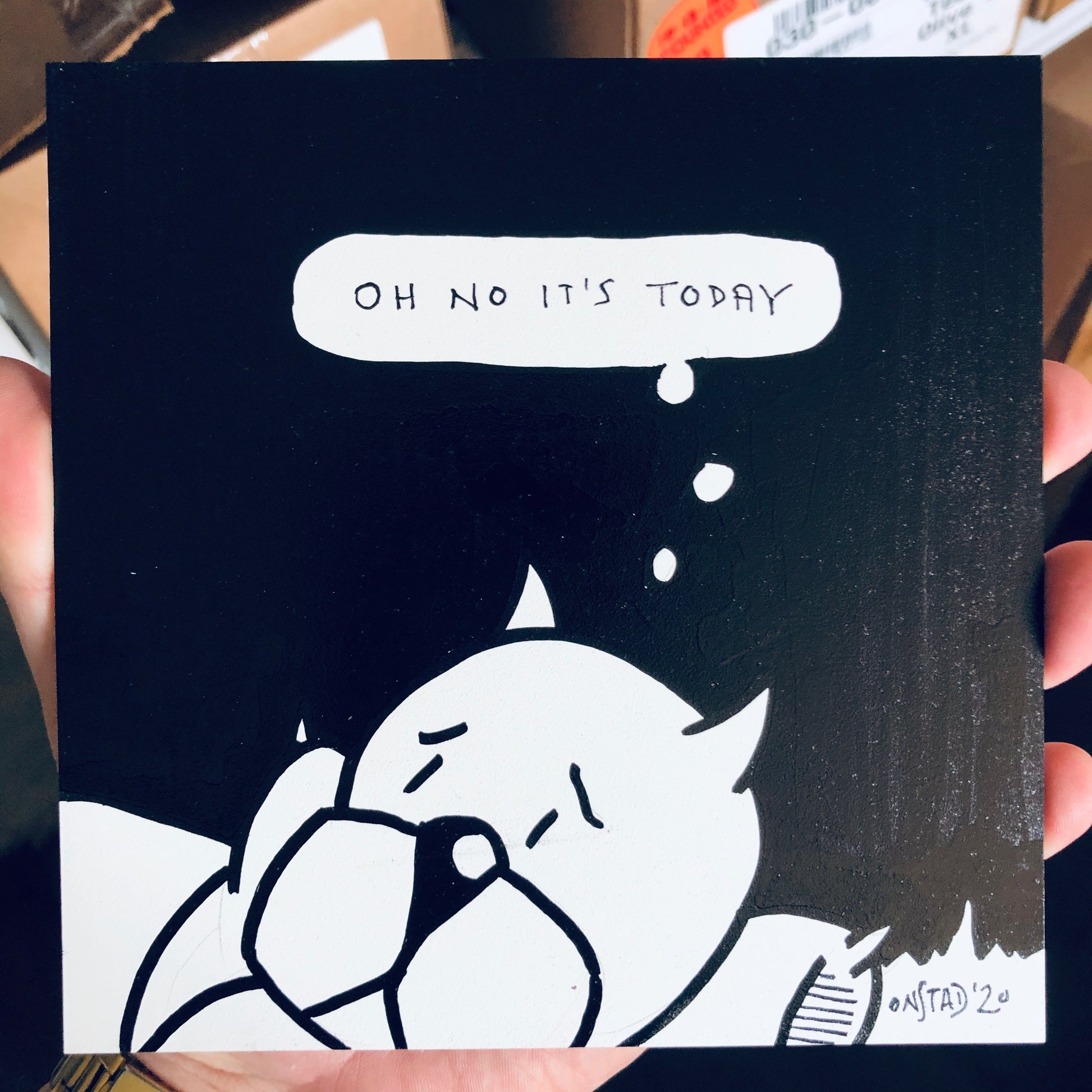 Quintessential Roast Beef, this panel clearly communicates the dread of waking to all who pass by. 6" square, oil pen on sealed bright white gesso board, 1/8" thick.