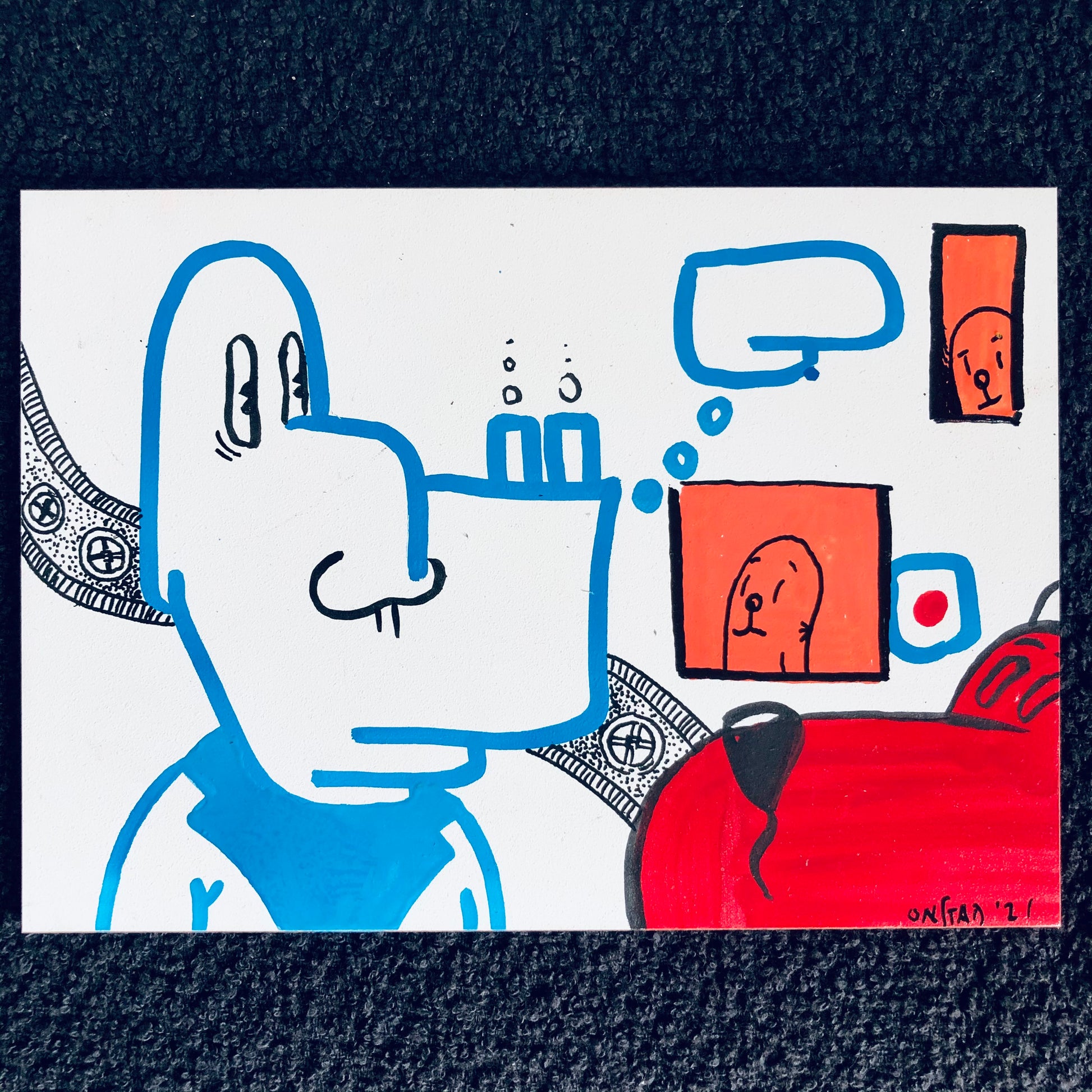 This panel is the best we can do at representing visually the way this young boy’s dreams feel. One of a series of framed 5x7” original oil pen illustrations. 1/8” gesso board, ready for framing!