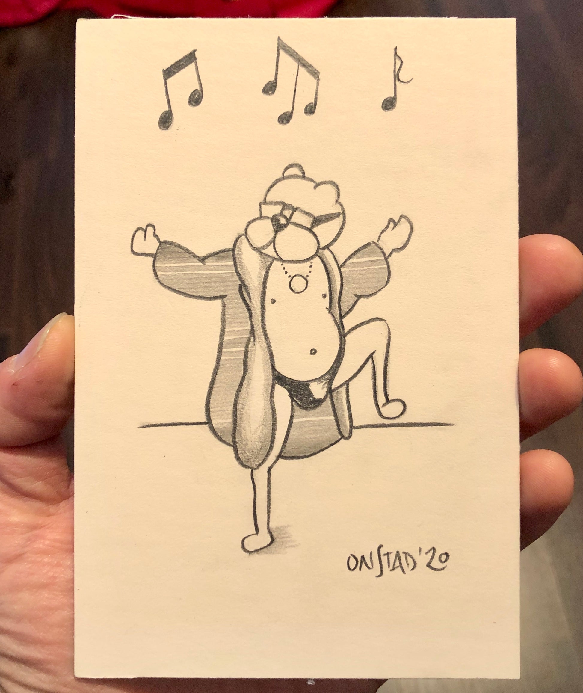This is the panel that prompted Toto to write Africa, knowing that someday this cat would dance this way to their masterpiece. 4x6” pencils on stiff white paperboard.
