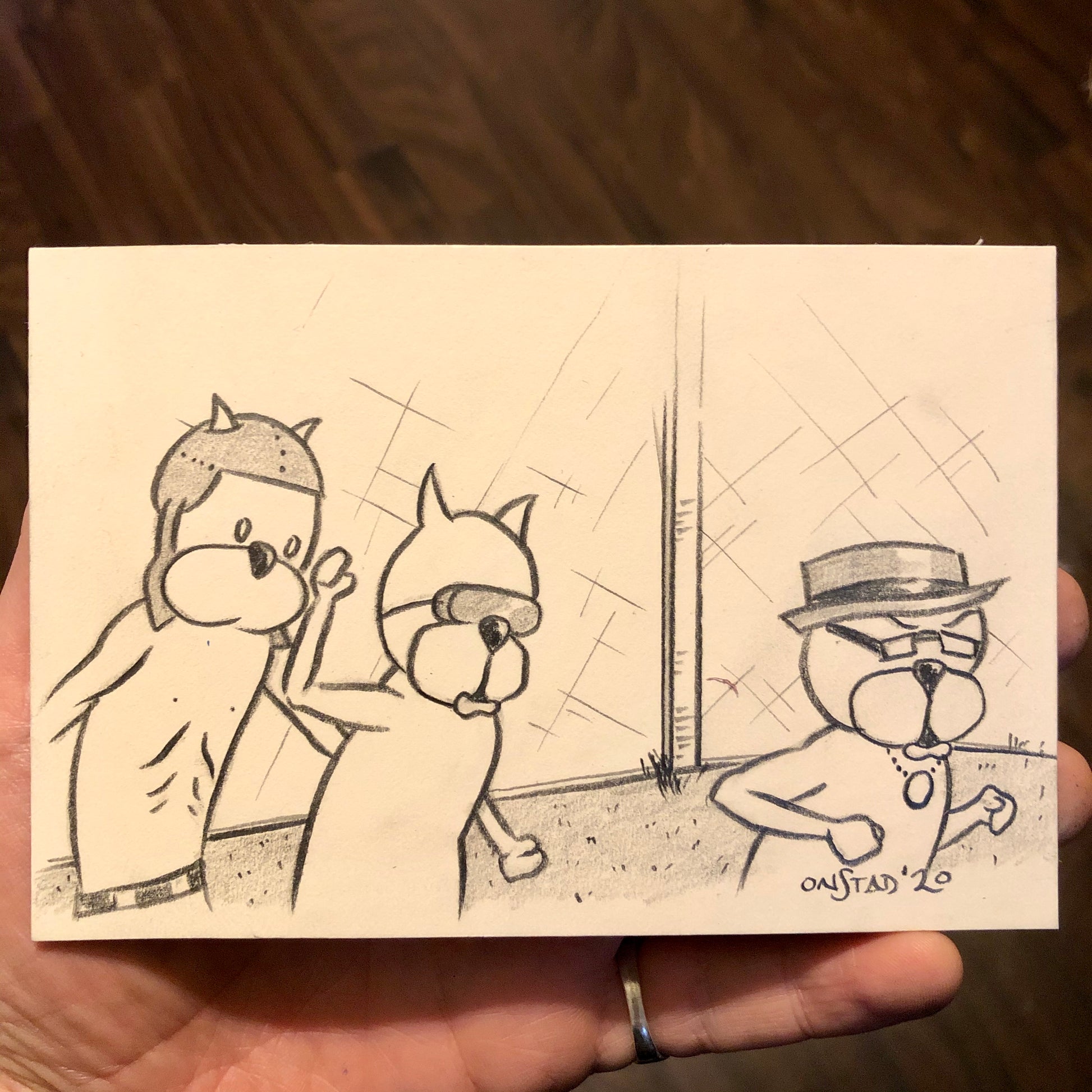 The sprint that started it all, off to the Northeast Corner. First actual gallery drawing of Leander, if I'm not mistaken. Hand-drawn original. 4x6” graphite pencil on stiff white paperboard.