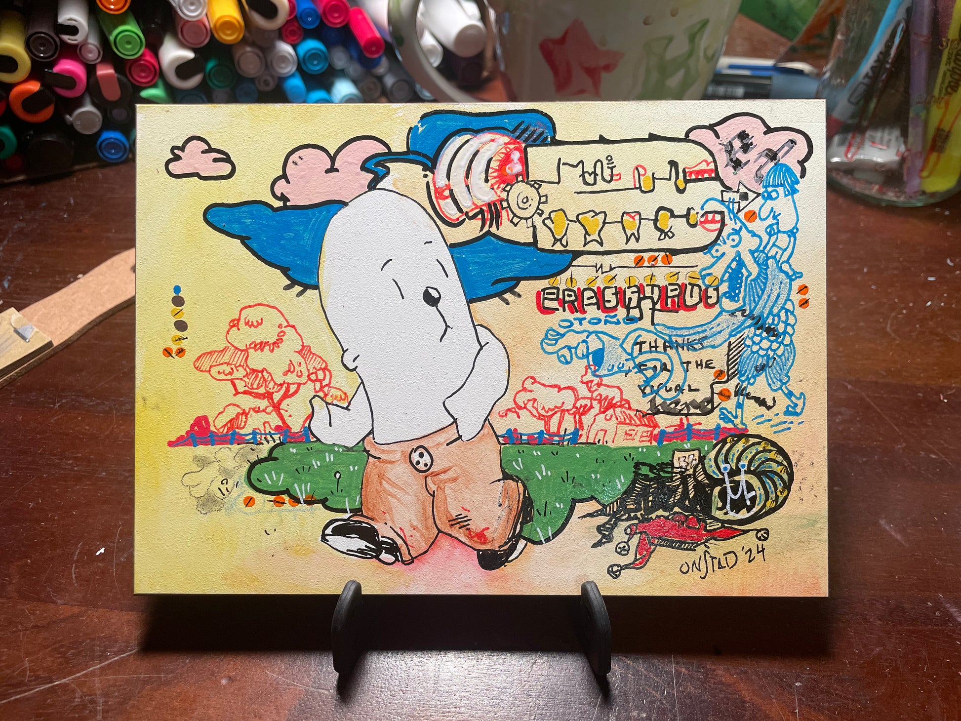 A walk past the Old Haunted Stump is different for every child; for Philippe it turned his beloved dinosaurs into a floating and ominous hawk-like God (?) whose obvious suffering from mutant dentition did not resolve with the commonly accepted notion of the divine. 5X7", oil pens, acrylics, and pencil on stiff 1/8" gesso board.