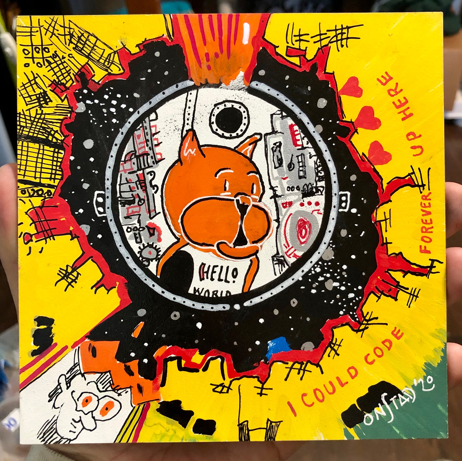 Roast Beef, his Radio Shack spacecraft awash in stars and antennae-debris amidst the sun-corona, finally has the cherished austerity within which to carve delicious code into the screen. 6” x 6” oil pens on bright white gesso hardboard.