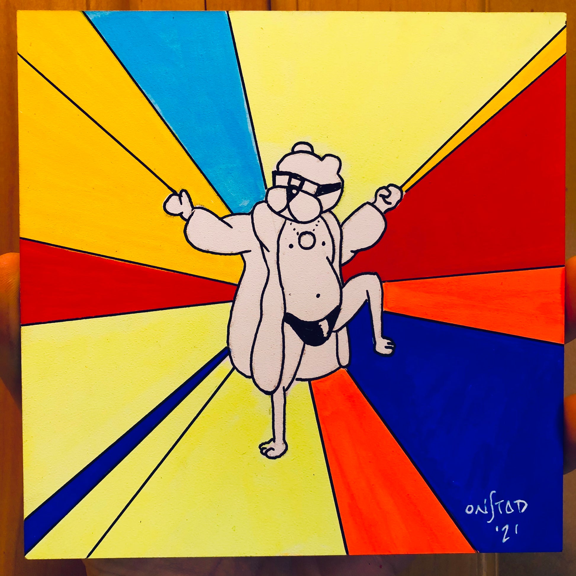 Using sophisticated and highly sensitive government equipment, we were finally able to capture imagery of the cosmic energy that is released when Ray dances to Africa by Toto. The results explain the inexorable draw of the timeless pleasure-portal his dancing creates. 6" square, oil pen on sealed bright white gesso board, 1/8" thick.