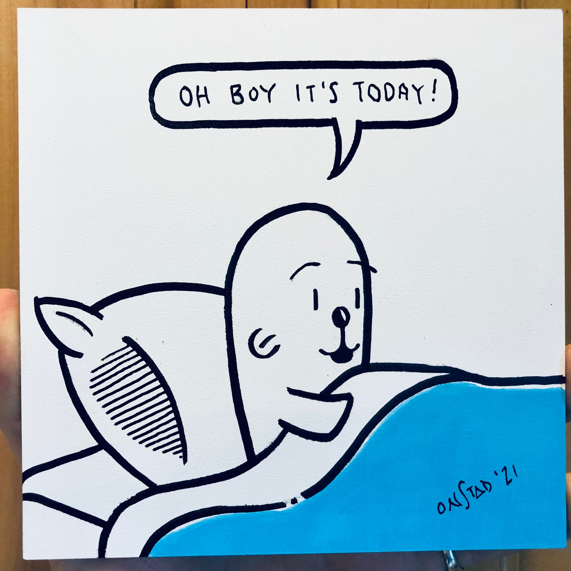 Quintessential Philippe, this panel clearly communicates to all who pass by the joyful opportunity which is presented by waking. 6" square, oil pen on sealed bright white gesso board, 1/8" thick.