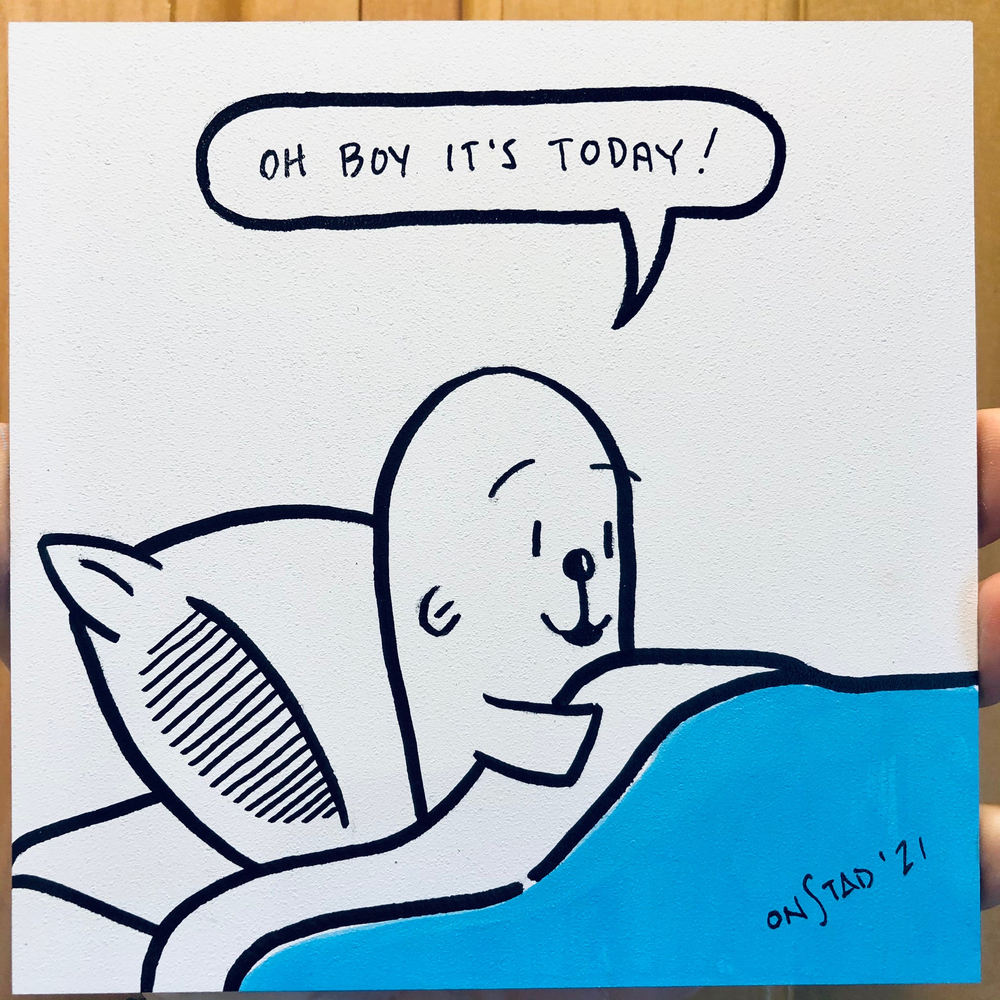 Quintessential Philippe, this panel clearly communicates to all who pass by the joyful opportunity which is presented by waking. 6" square, oil pen on sealed bright white gesso board, 1/8" thick.