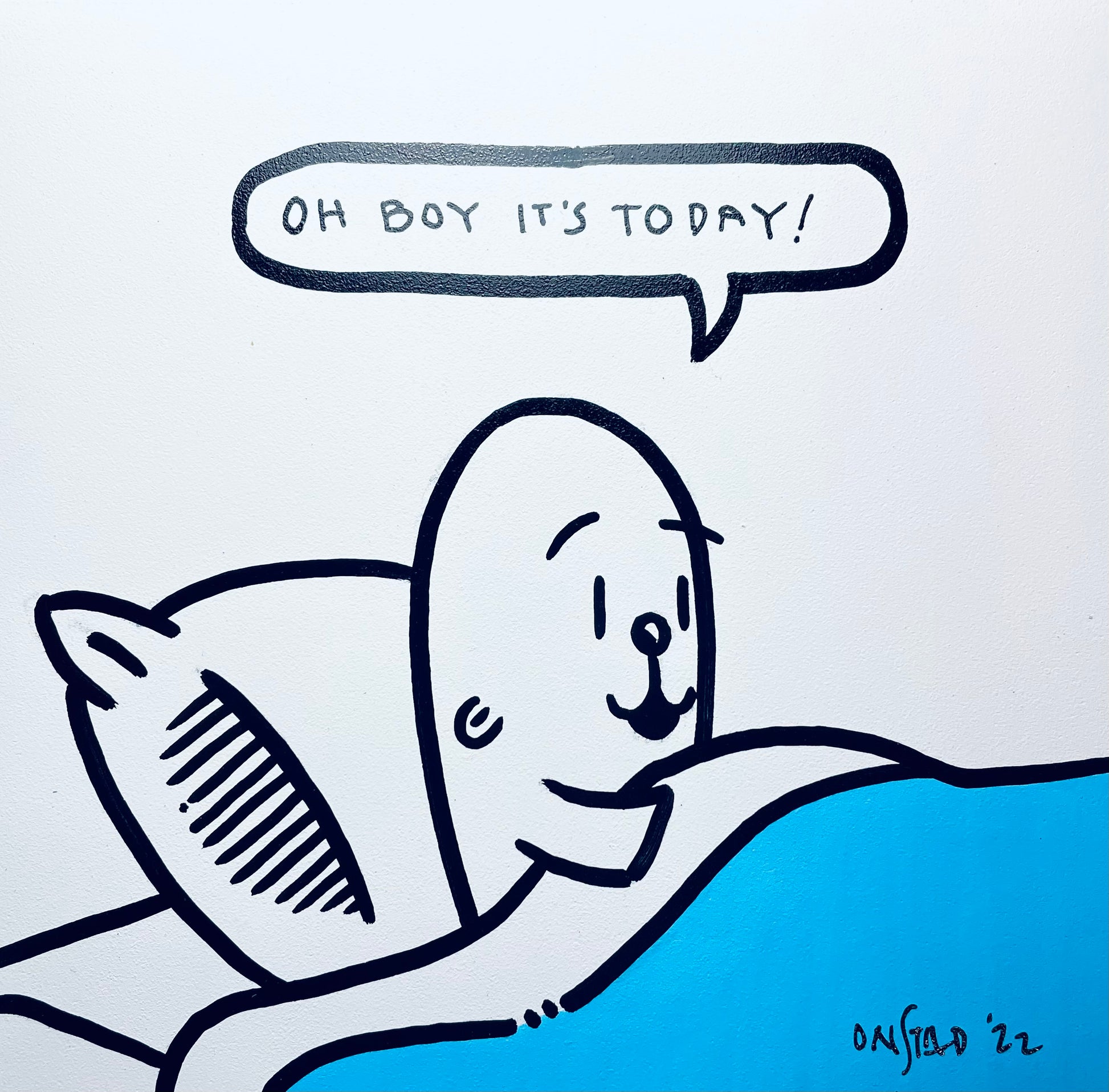 Quintessential Philippe, this panel clearly communicates to all who pass by the joyful opportunity which is presented by waking. 6" square, oil pen on sealed bright white gesso board, 1/8" thick.