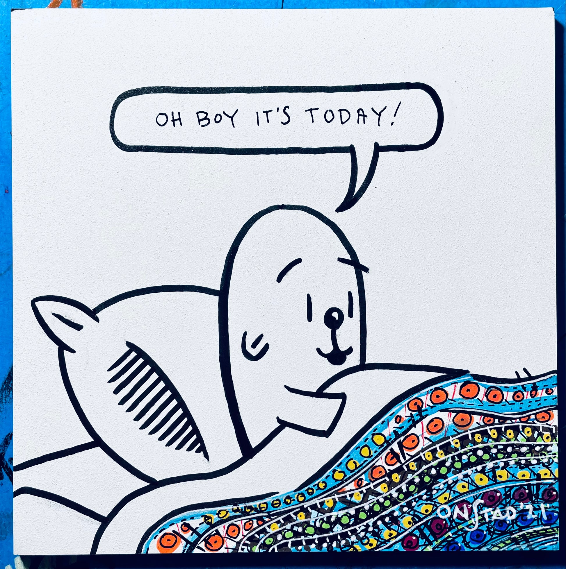 Quintessential Philippe, this panel clearly communicates to all who pass by the joyful opportunity which is presented by waking. 6" square, oil pen on sealed bright white gesso board, 1/8" thick.
