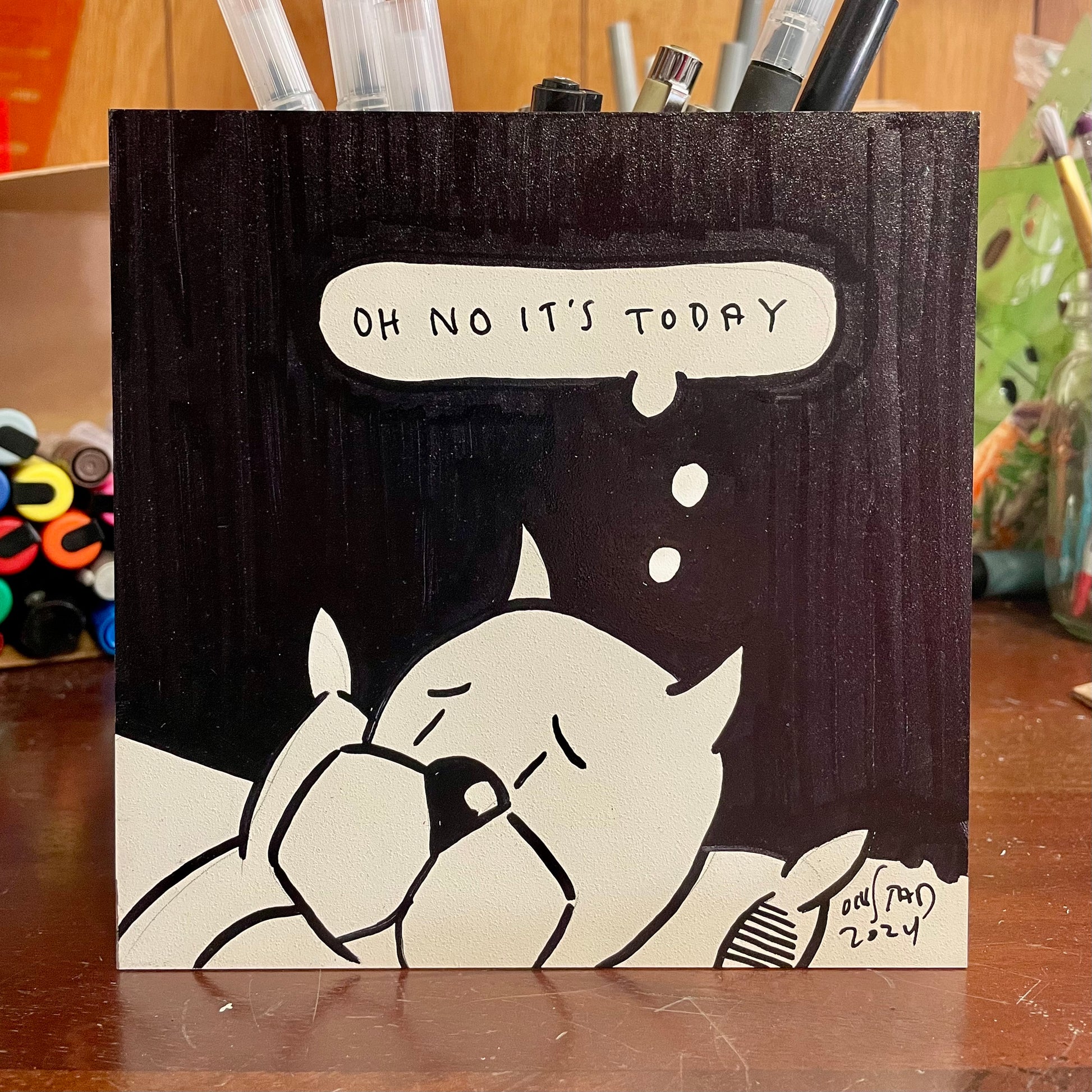 Quintessential Roast Beef, this panel clearly communicates the dread of waking to all who pass by. 6" square, oil pen on sealed bright white gesso board, 1/8" thick.