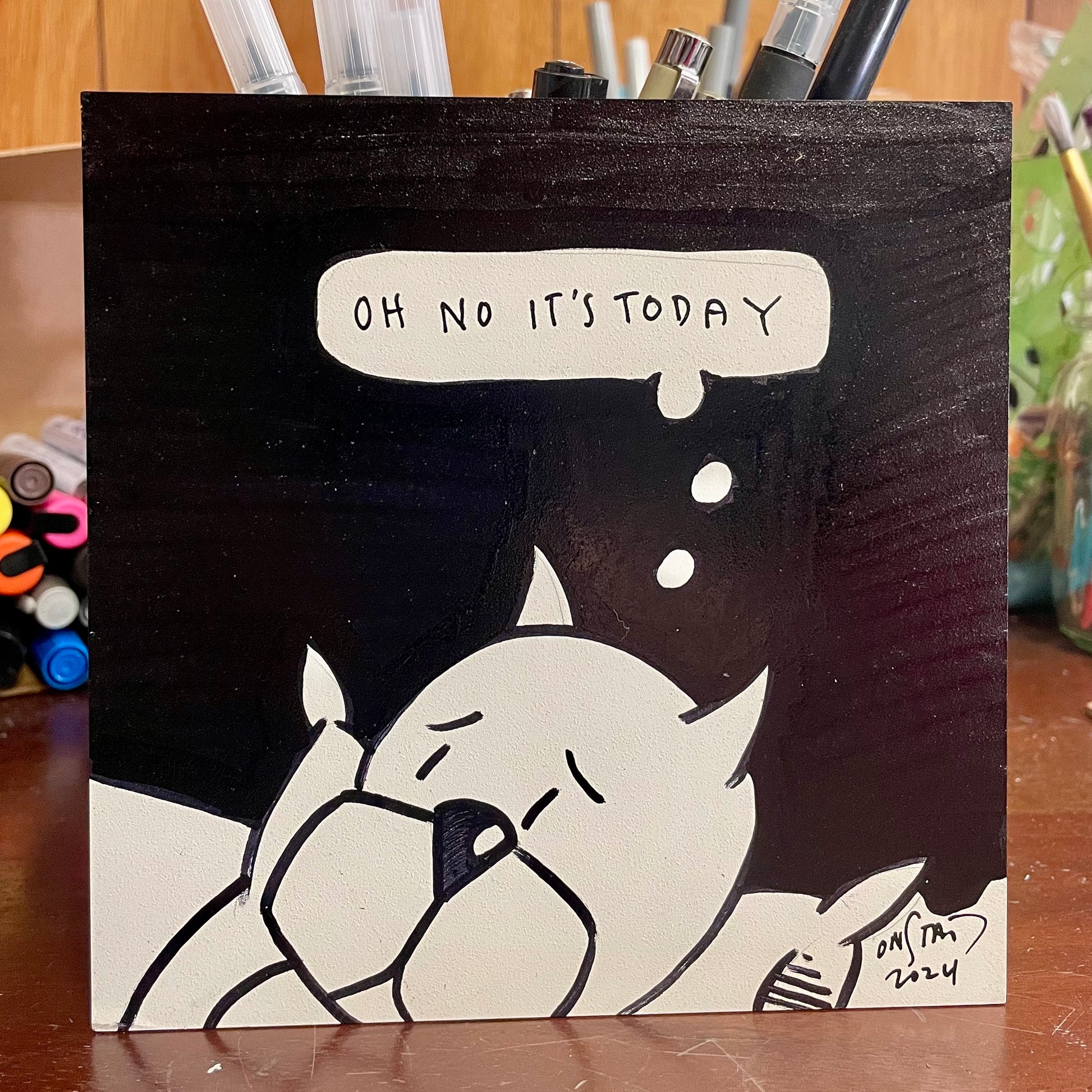 Quintessential Roast Beef, this panel clearly communicates the dread of waking to all who pass by. 6" square, oil pen on sealed bright white gesso board, 1/8" thick.