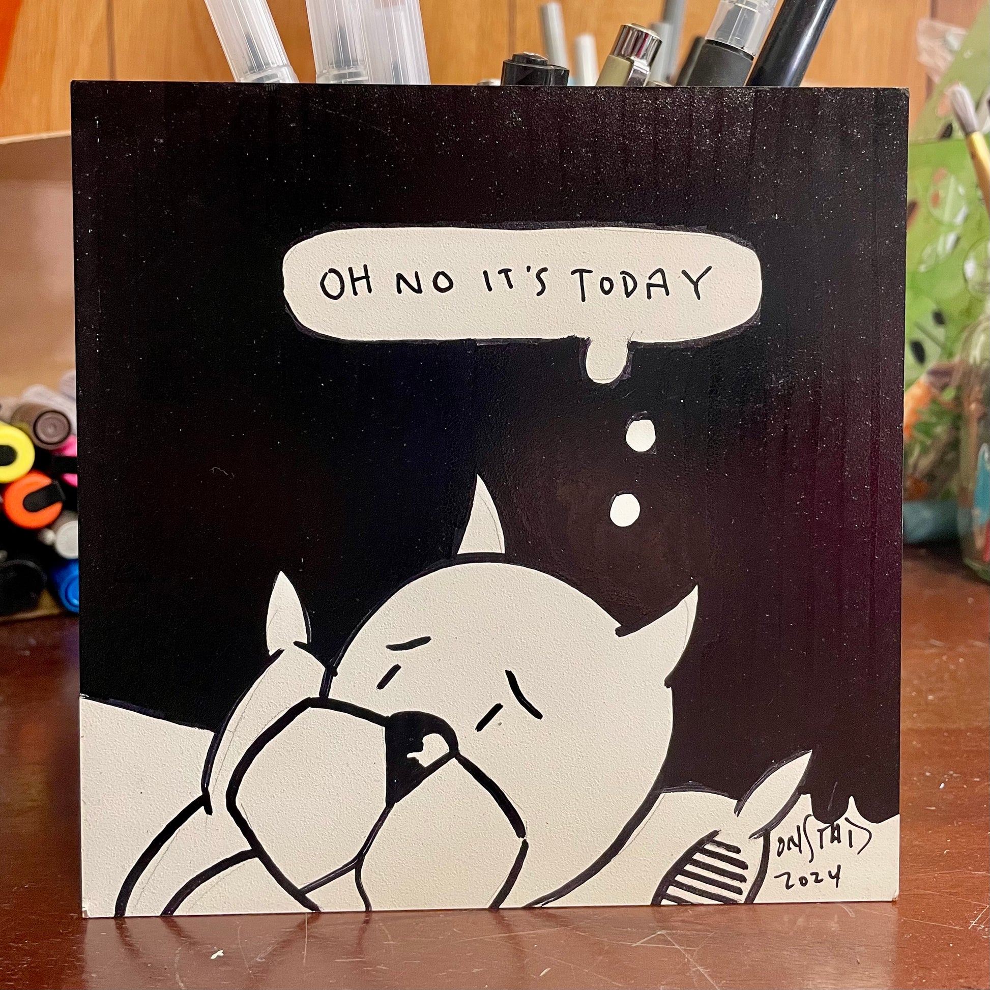 Quintessential Roast Beef, this panel clearly communicates the dread of waking to all who pass by. 6" square, oil pen on sealed bright white gesso board, 1/8" thick.
