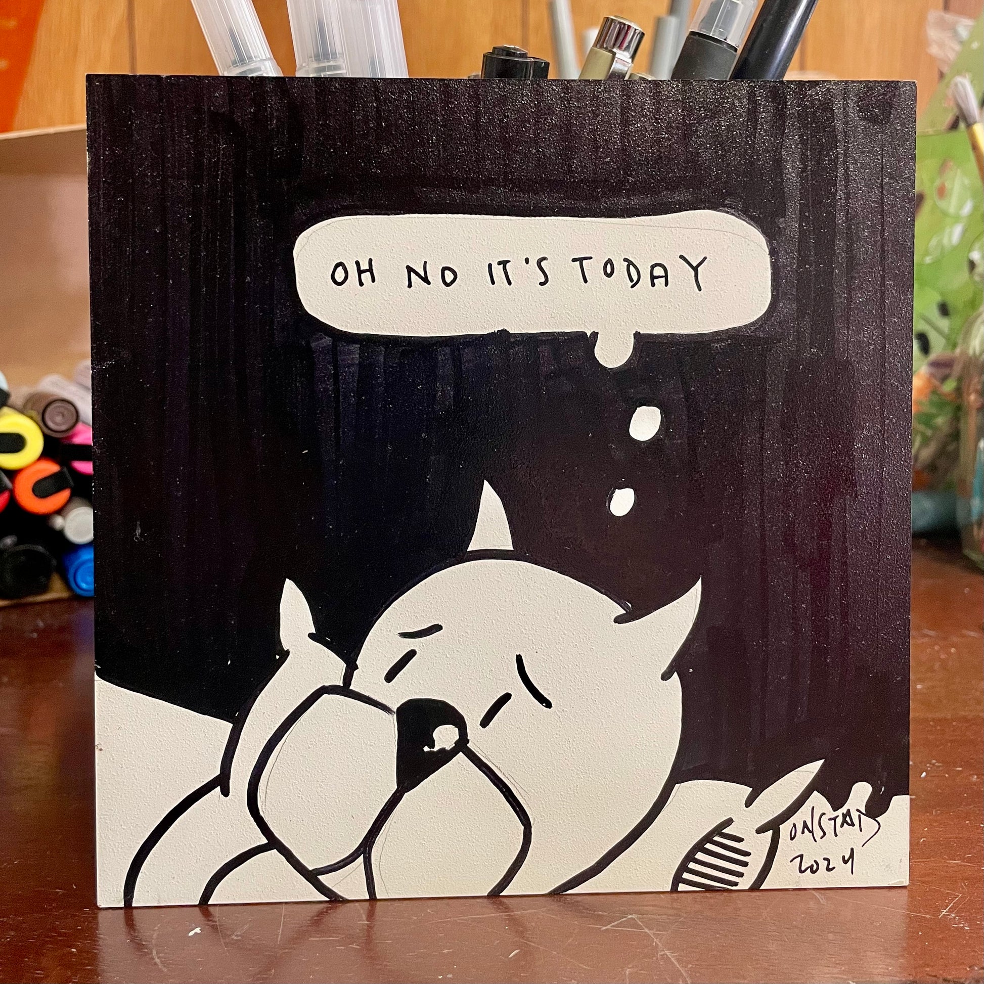 Quintessential Roast Beef, this panel clearly communicates the dread of waking to all who pass by. 6" square, oil pen on sealed bright white gesso board, 1/8" thick.