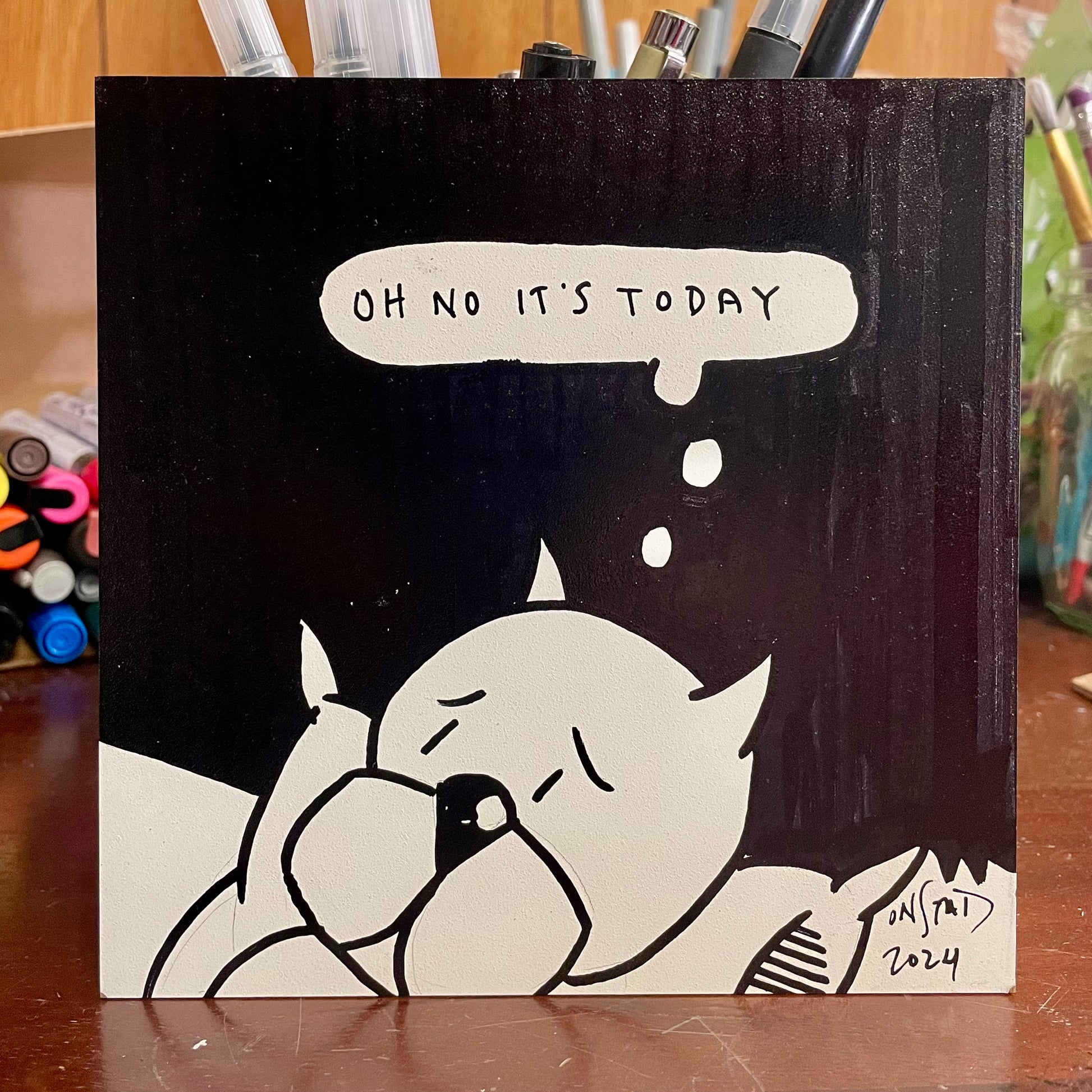 Quintessential Roast Beef, this panel clearly communicates the dread of waking to all who pass by. 6" square, oil pen on sealed bright white gesso board, 1/8" thick.