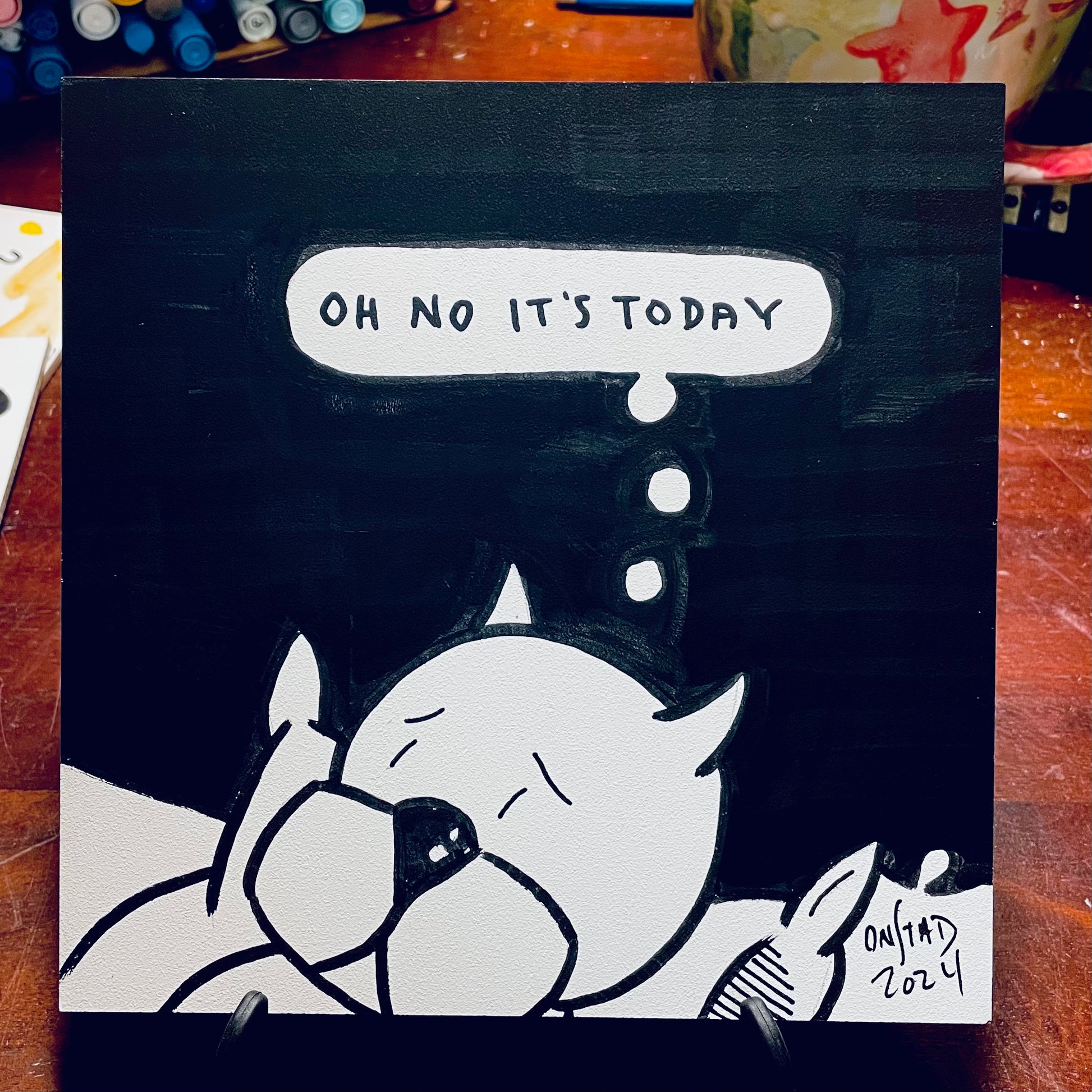 Quintessential Roast Beef, this panel clearly communicates the dread of waking to all who pass by. 6" square, oil pen on sealed bright white gesso board, 1/8" thick.