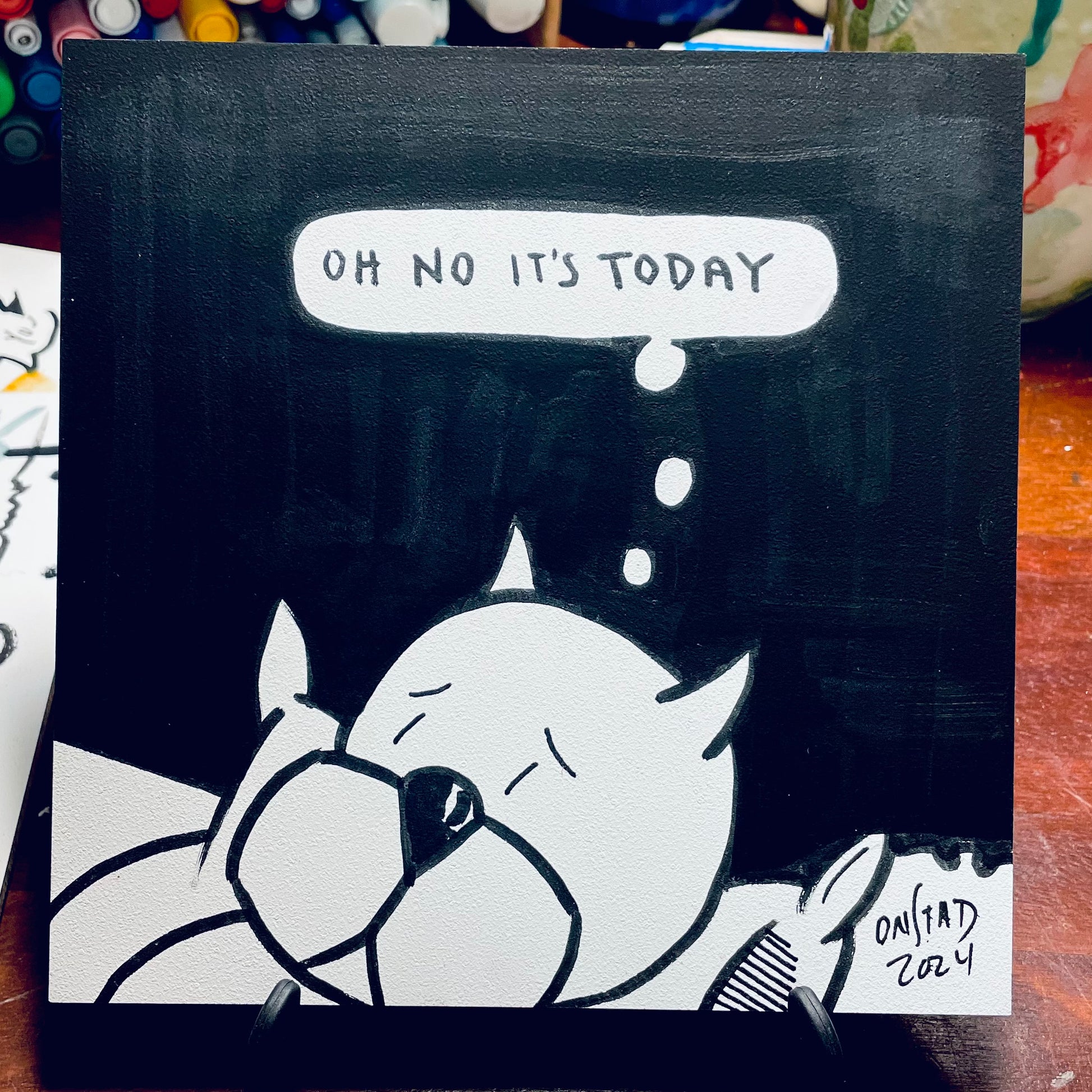 Quintessential Roast Beef, this panel clearly communicates the dread of waking to all who pass by. 6" square, oil pen on sealed bright white gesso board, 1/8" thick.