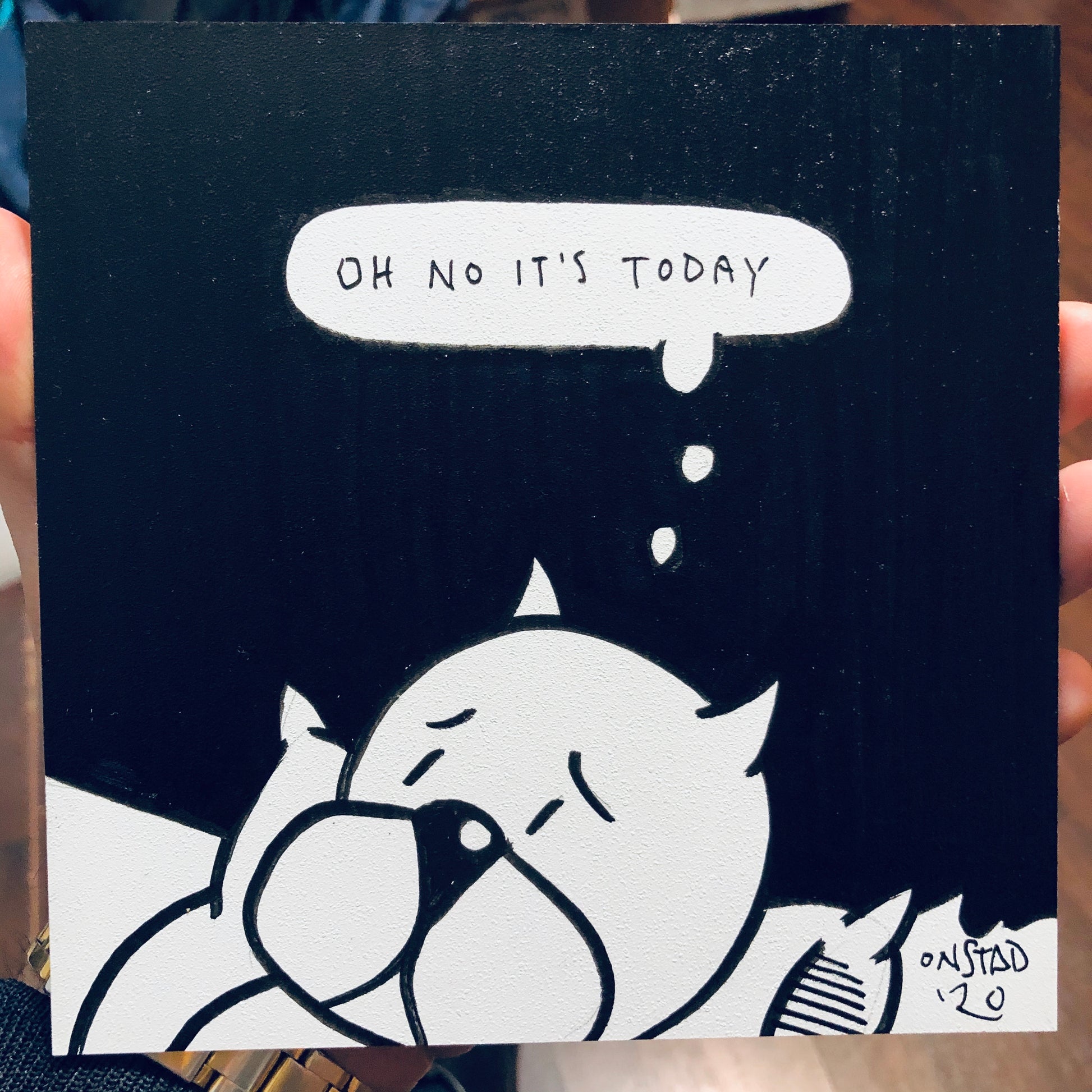 Quintessential Roast Beef, this panel clearly communicates the dread of waking to all who pass by. 6" square, oil pen on sealed bright white gesso board, 1/8" thick.