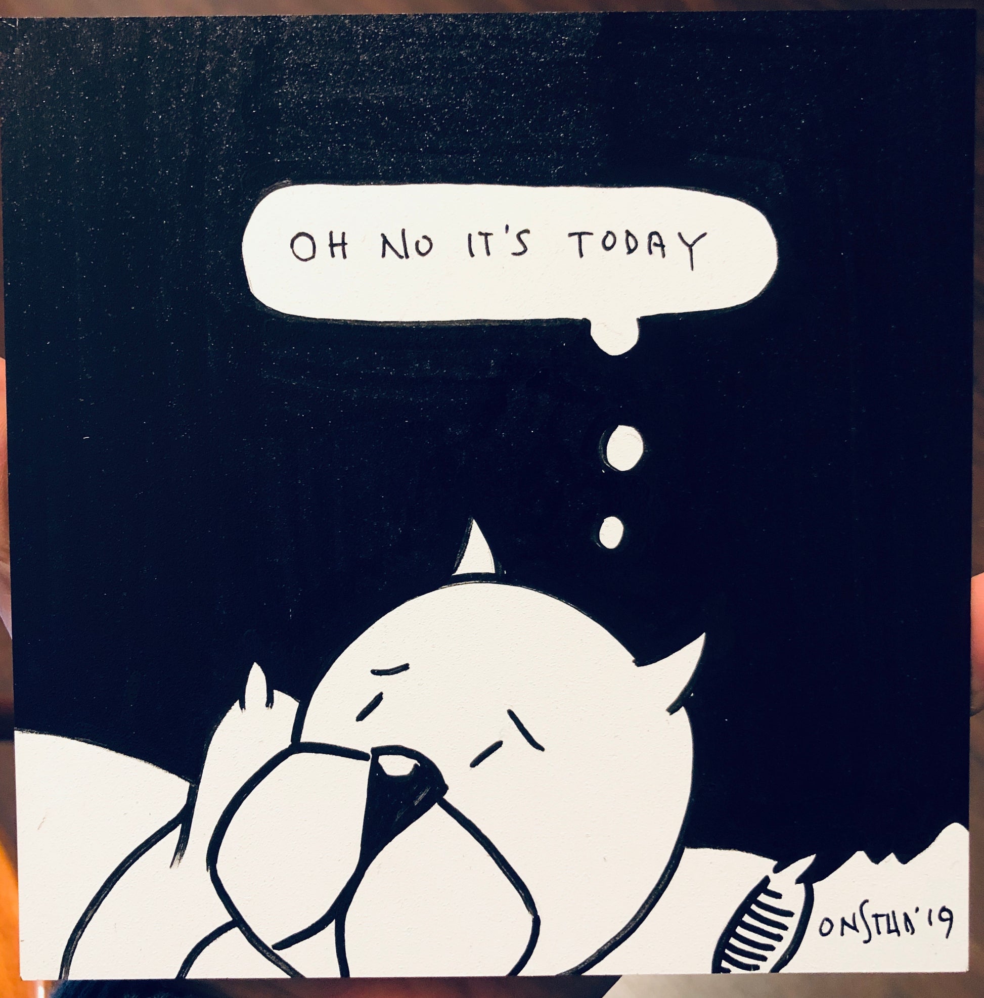 Quintessential Roast Beef, this panel clearly communicates the dread of waking to all who pass by. 6" square, oil pen on sealed bright white gesso board, 1/8" thick.