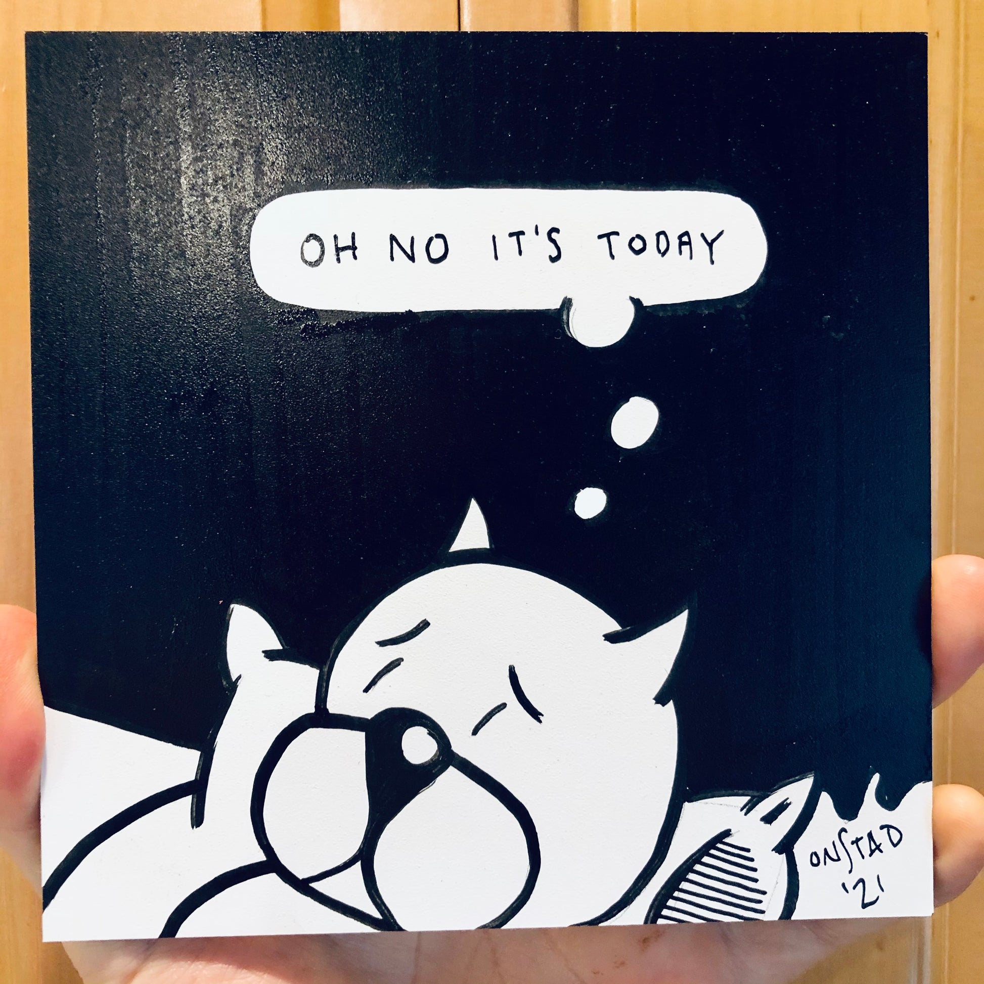 Quintessential Roast Beef, this panel clearly communicates the dread of waking to all who pass by. 6" square, oil pen on sealed bright white gesso board, 1/8" thick.