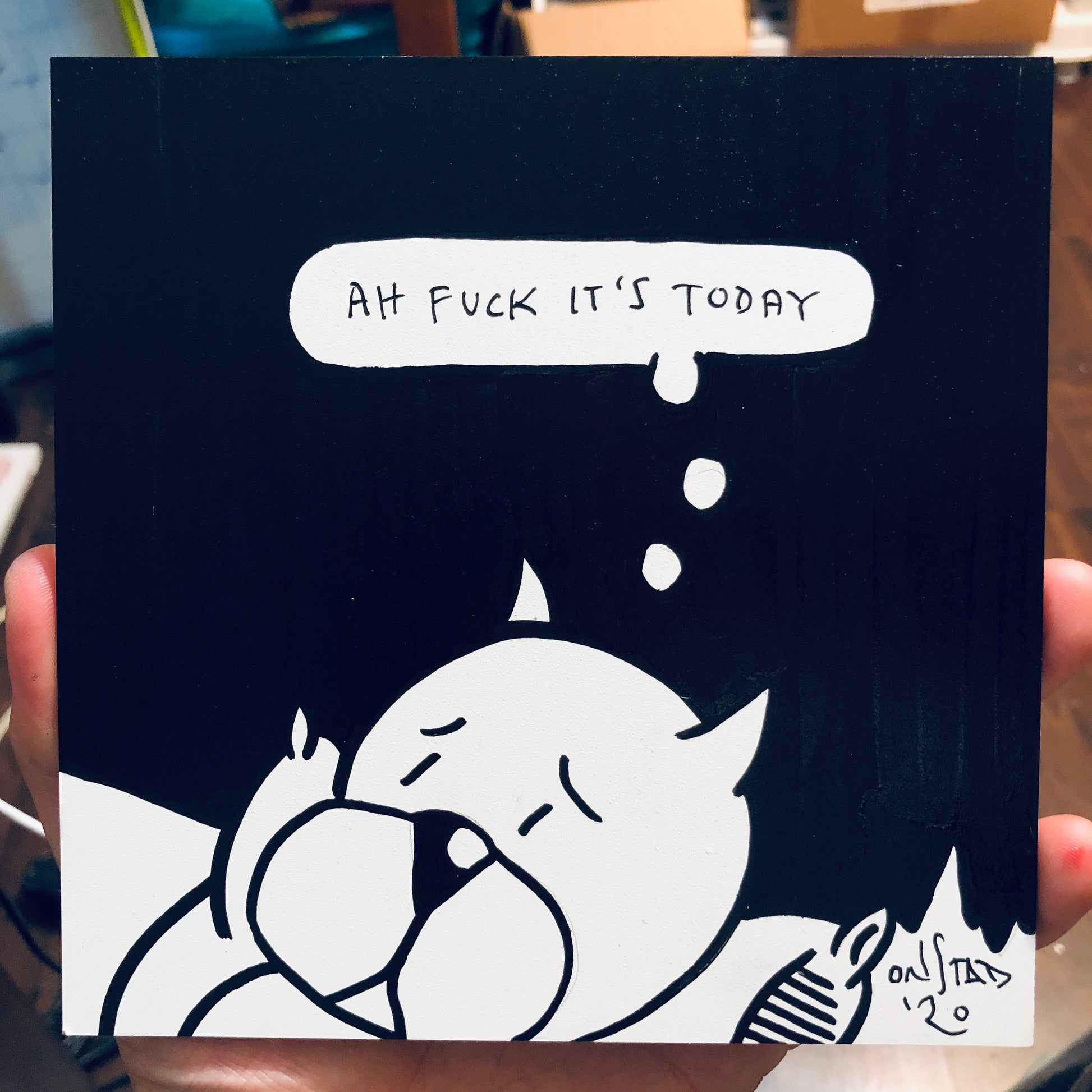 Quintessential Roast Beef, this panel clearly communicates the dread of waking to all who pass by -- with a spicy word in this edition! 6" square, oil pen on sealed bright white gesso board, 1/8" thick.