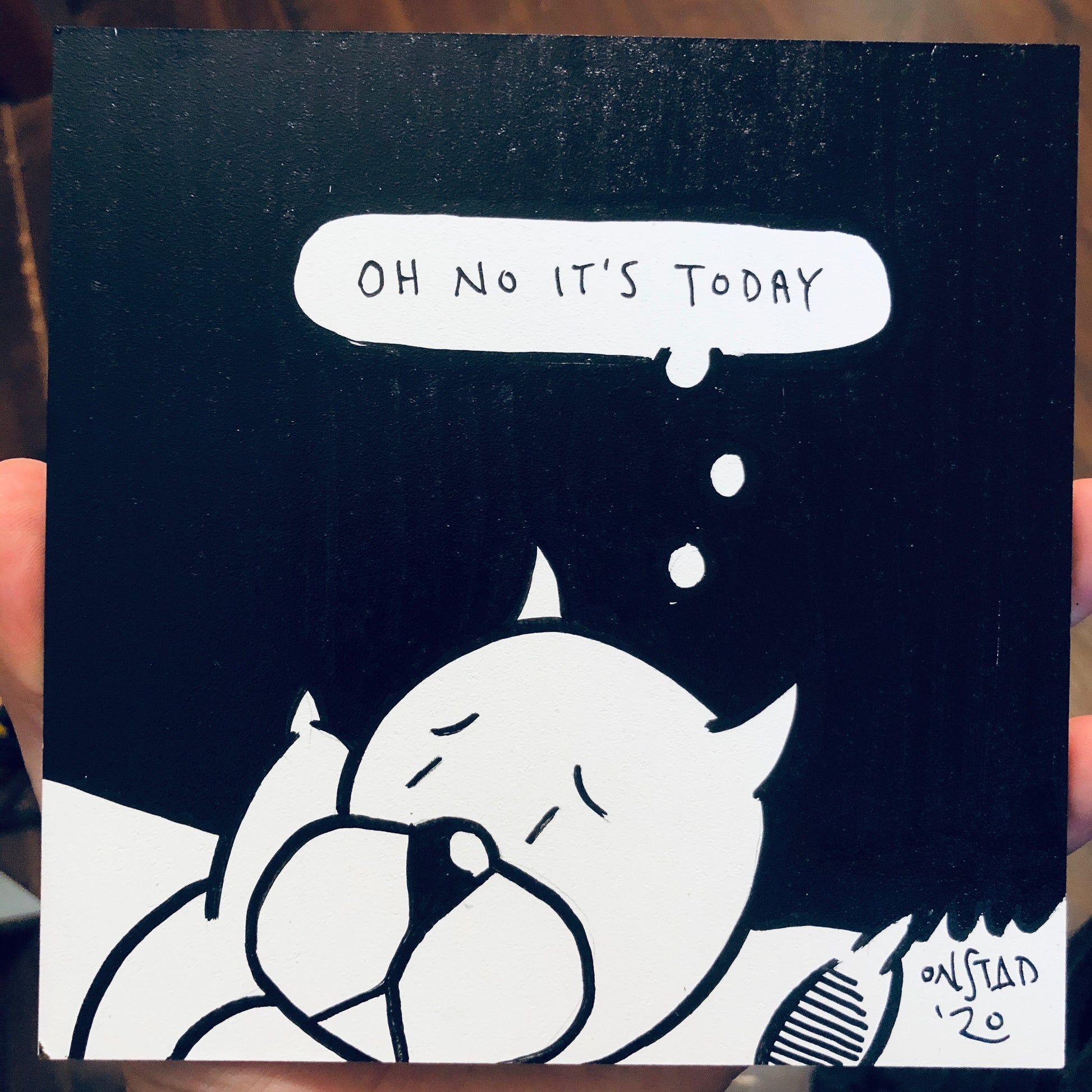 Quintessential Roast Beef, this panel clearly communicates the dread of waking, to all who pass by. 6" square, oil pen on sealed bright white gesso board, 1/8" thick.