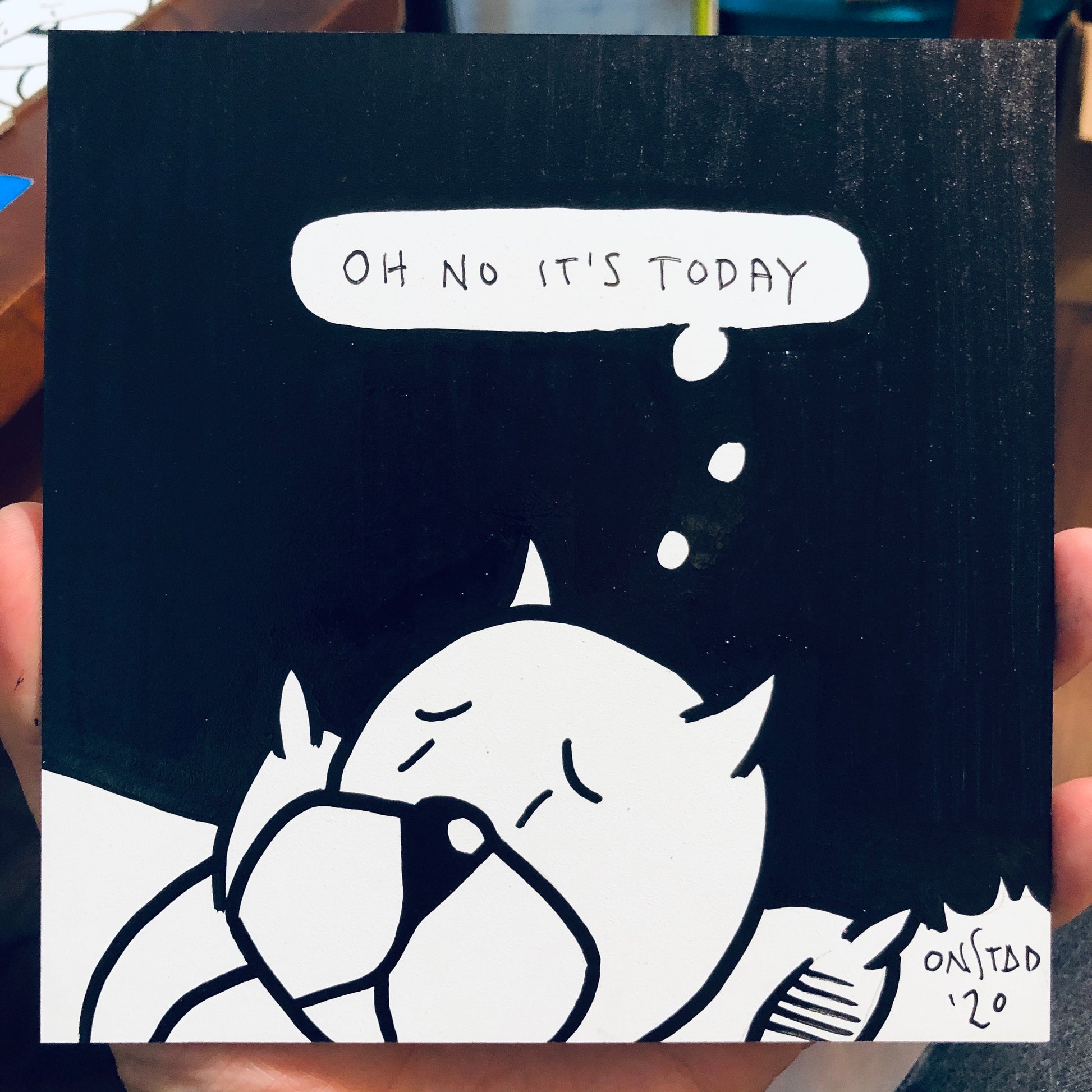 Quintessential Roast Beef, this panel clearly communicates the dread of waking to all who pass by. 6" square, oil pen on sealed bright white gesso board, 1/8" thick.