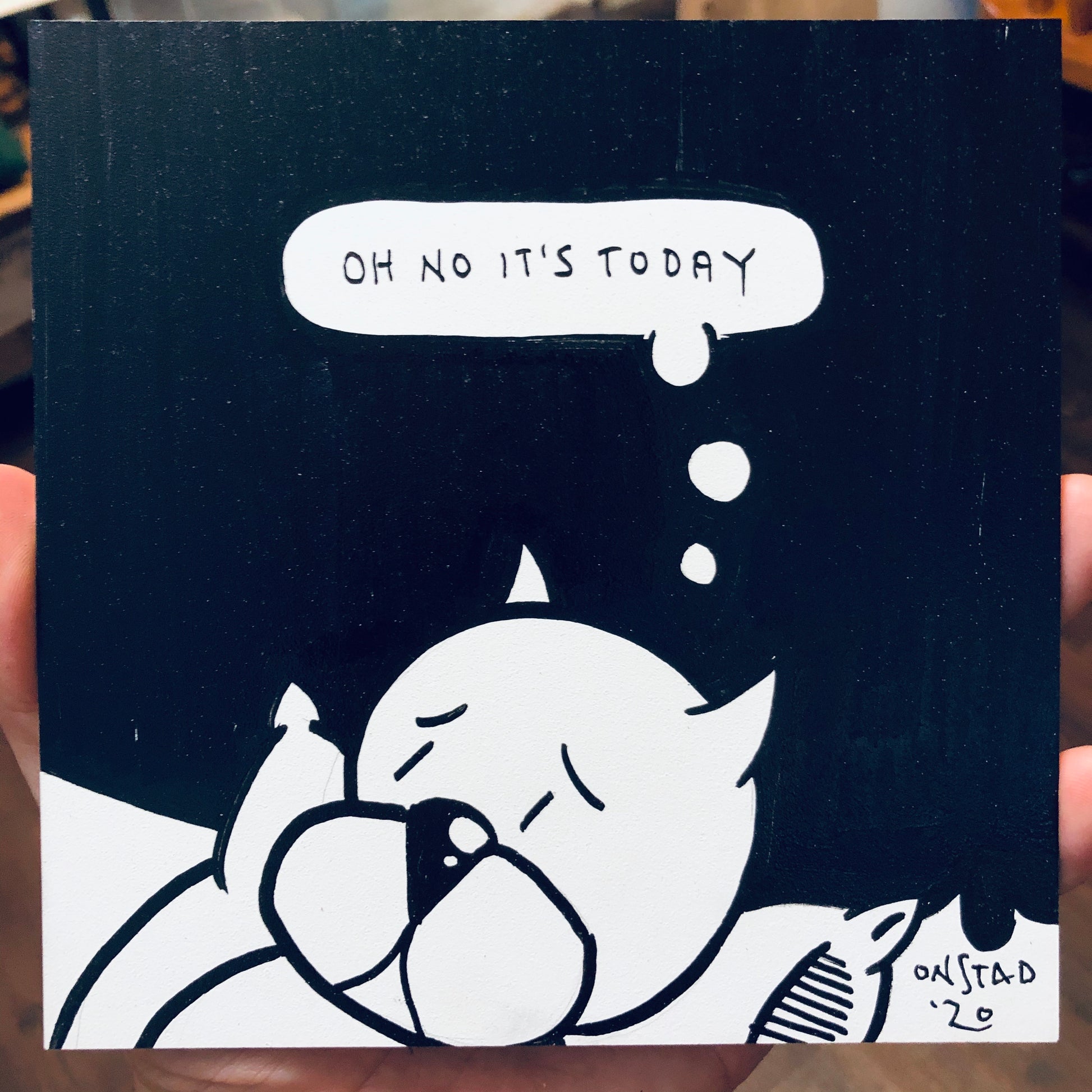 Quintessential Roast Beef, this panel clearly communicates the dread of waking to all who pass by. 6" square, oil pen on sealed bright white gesso board, 1/8" thick.