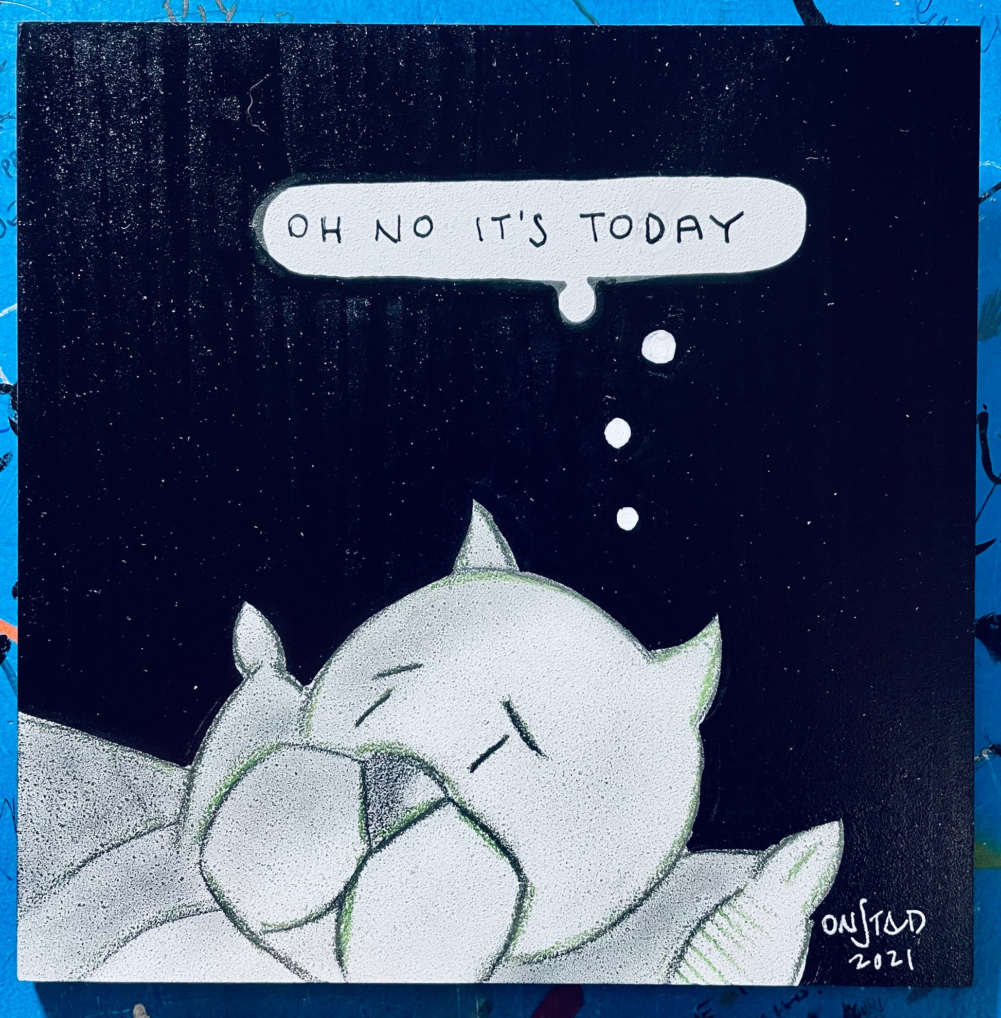 Quintessential Roast Beef, this panel clearly communicates the dread of waking to all who pass by. 6" square, oil pen and pencil on sealed bright white gesso board, 1/8" thick.