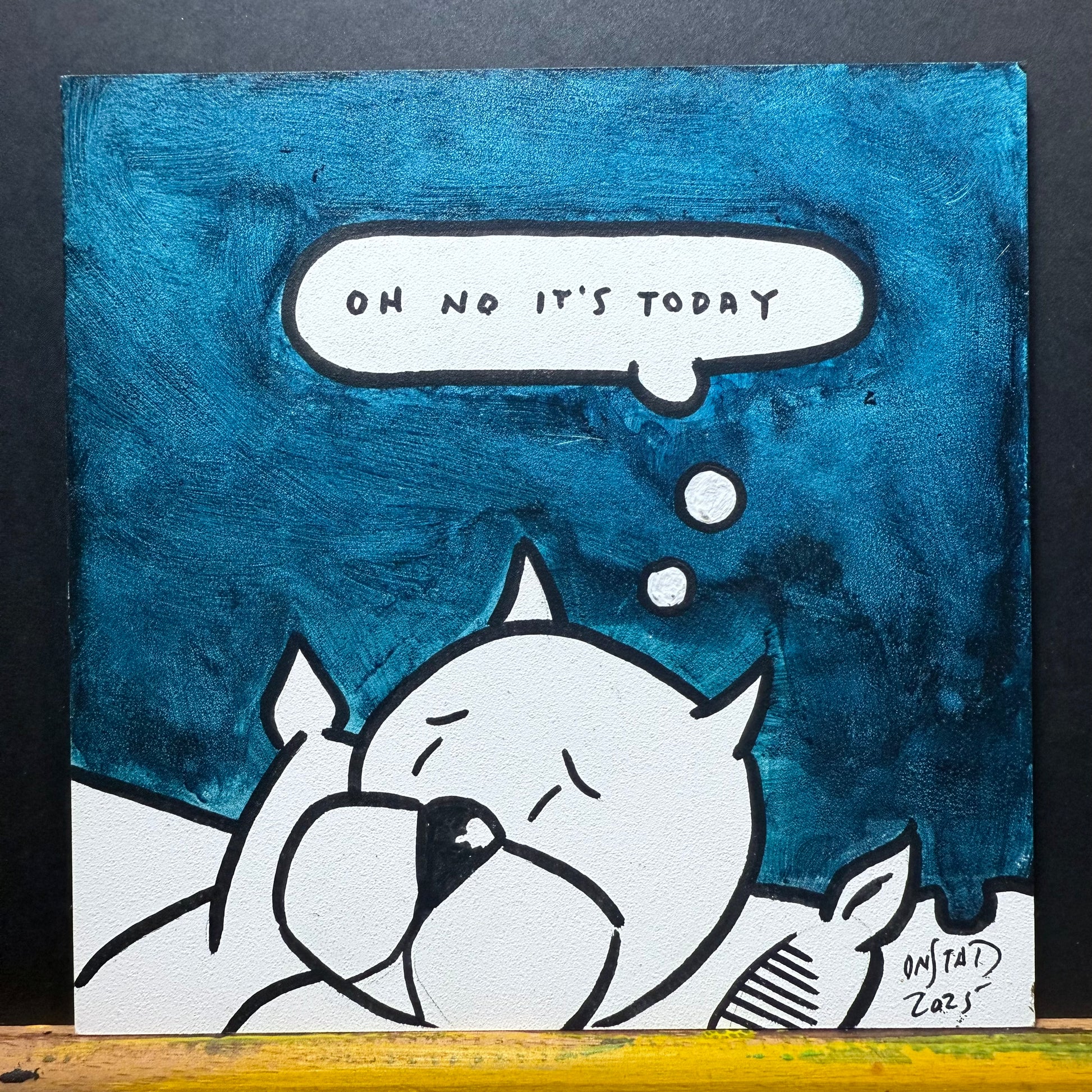 Quintessential Roast Beef, this panel clearly communicates the dread of waking to all who pass by. 6" square, acrylic wash and acrylic pen on sealed bright white gesso board, 1/8" thick.