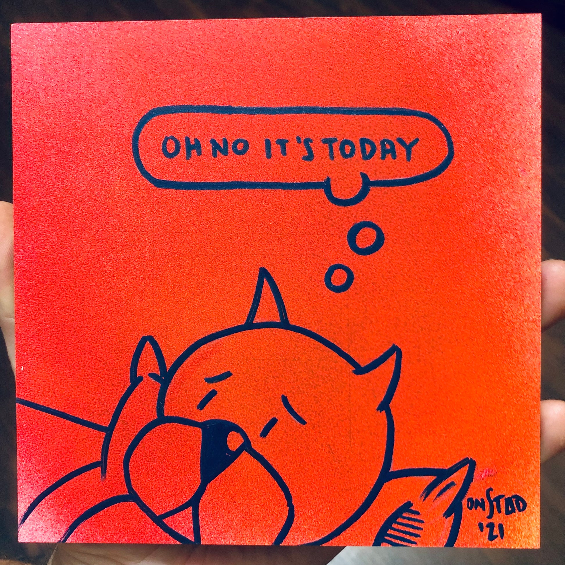A colorway variation on the classic. Quintessential Roast Beef, this panel clearly communicates the dread of waking to all who pass by. 6" square, spray paint and oil pen on sealed bright white gesso board, 1/8" thick.
