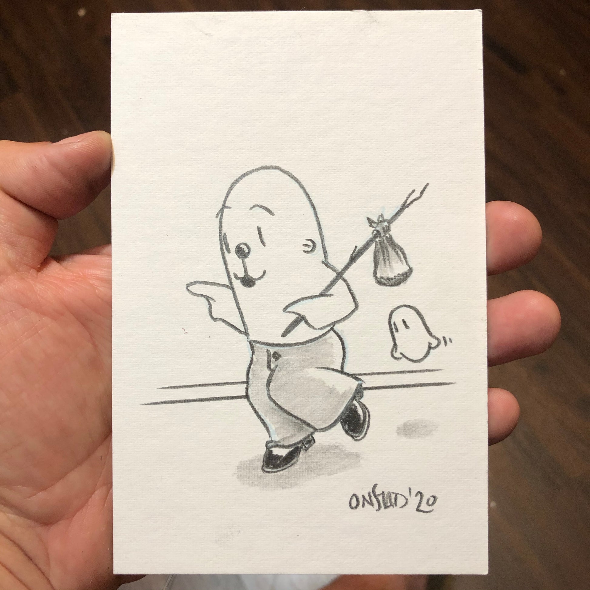 "Come right this way!" yelled Philippe, excitedly. "There's a dead possum by the train tracks and we have to give it a proper burial!" Lil' Ghost Buddy dropped what he was doing and followed his friend to the expired animal. 4x6” pencils on stiff white paperboard.