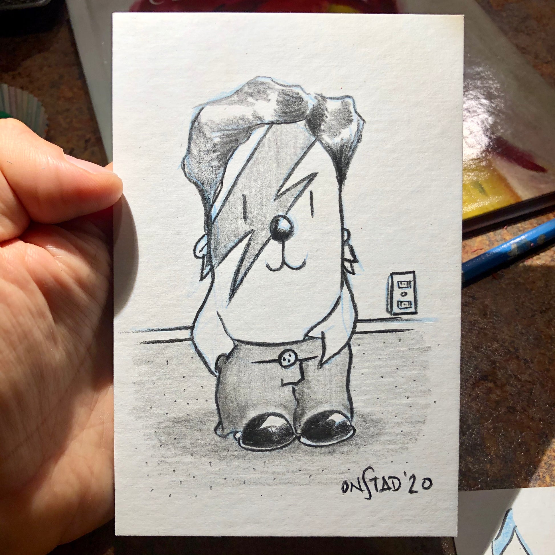 Téodor gave Philippe his annual Bowie treatment, which immediately got smeared on the new beige couch. 4x6” pencils on stiff white paperboard.