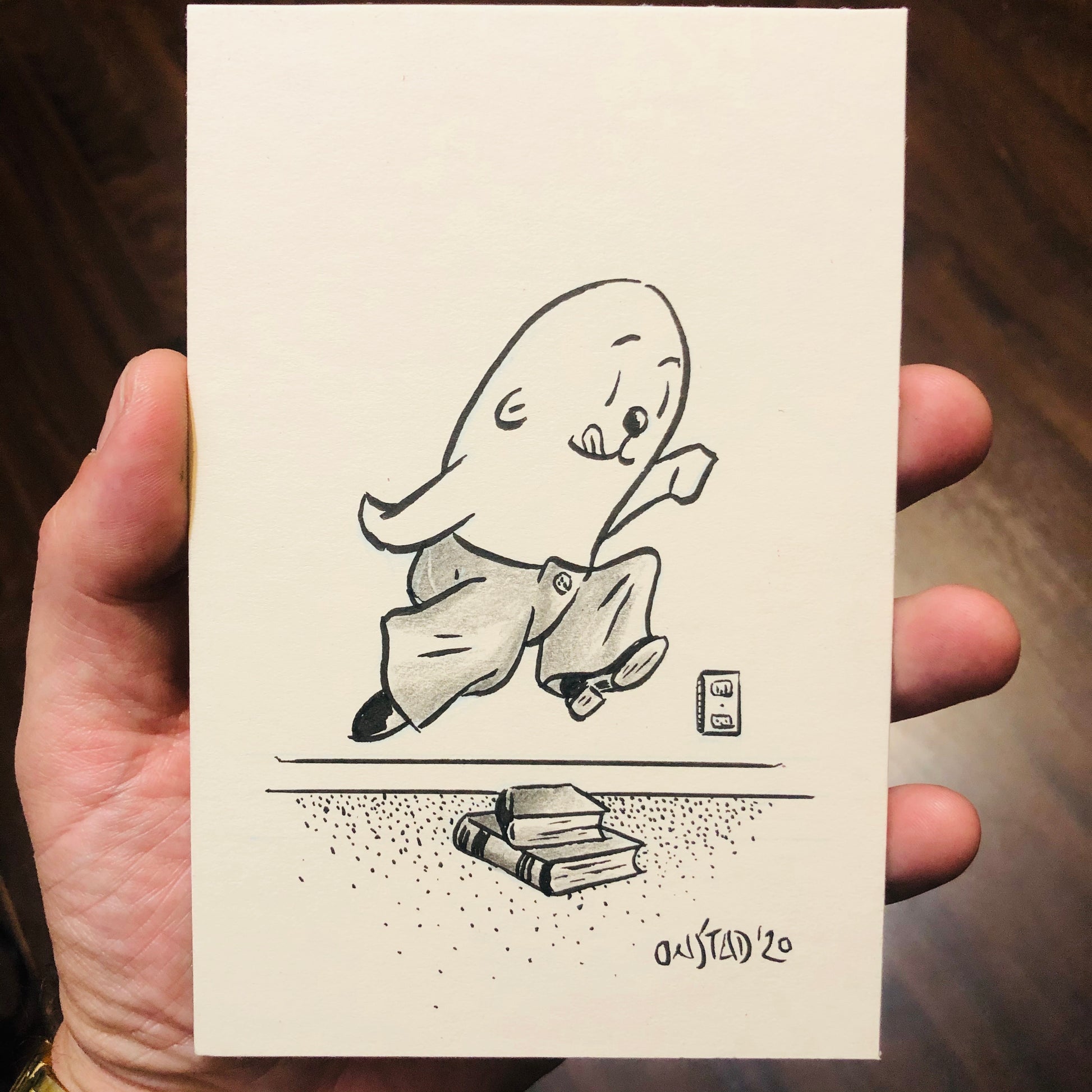 Two heavily worn biographies of Churchill sit on the living room floor. Somewhere, Cornelius Bear's ear is twitching. 4x6” pencils and brush pen on stiff white paperboard.