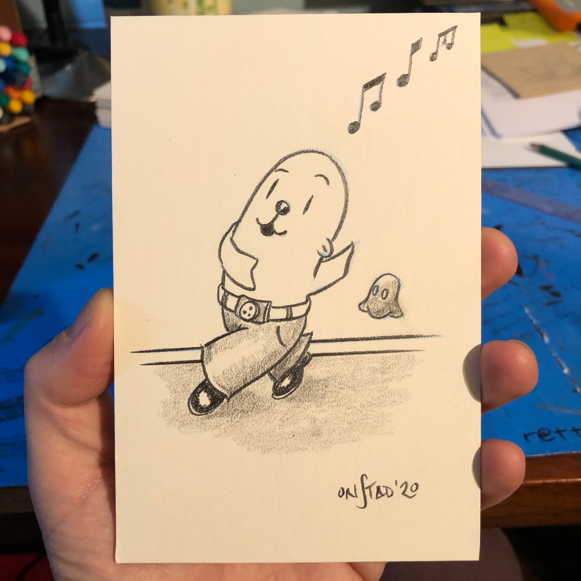 Like Fred Astaire, everything he does is forward and in regular shoes. 4x6” pencils on stiff white paperboard.
