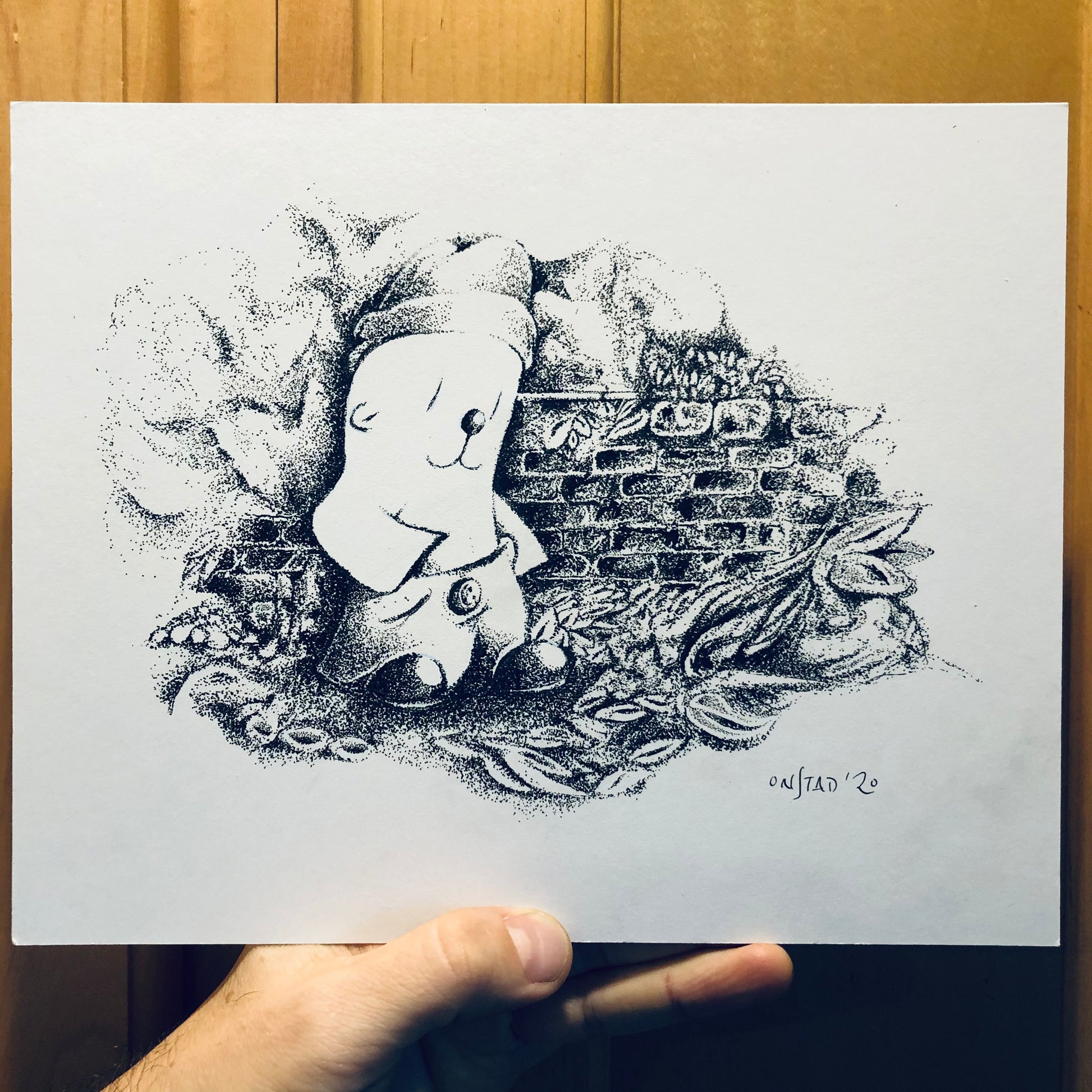 I spent days on this piece, enjoying this meditative new medium. It’s hard to fuck up with just one dot. I came close a couple times, but fortunately I was able to disguise it with other, nearby dots that looked intentional. 8x10” ink on stiff white paperboard.