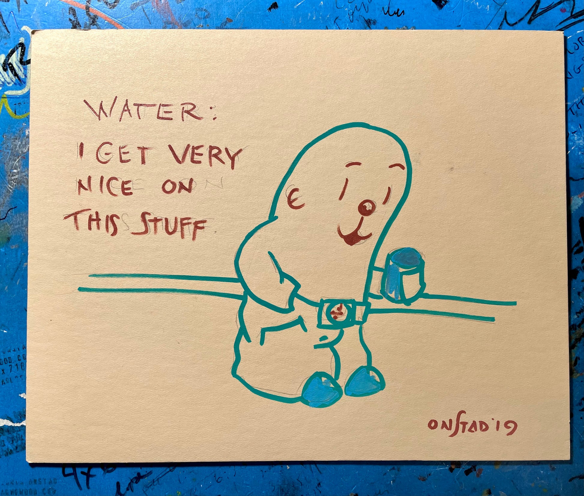 A light piece which celebrates health. Hang it next to your not drinking! 8" x 10" in oil pen on a warm off-white rigid matte paperboard. Original penciling details visible. Quite ready for framing.
