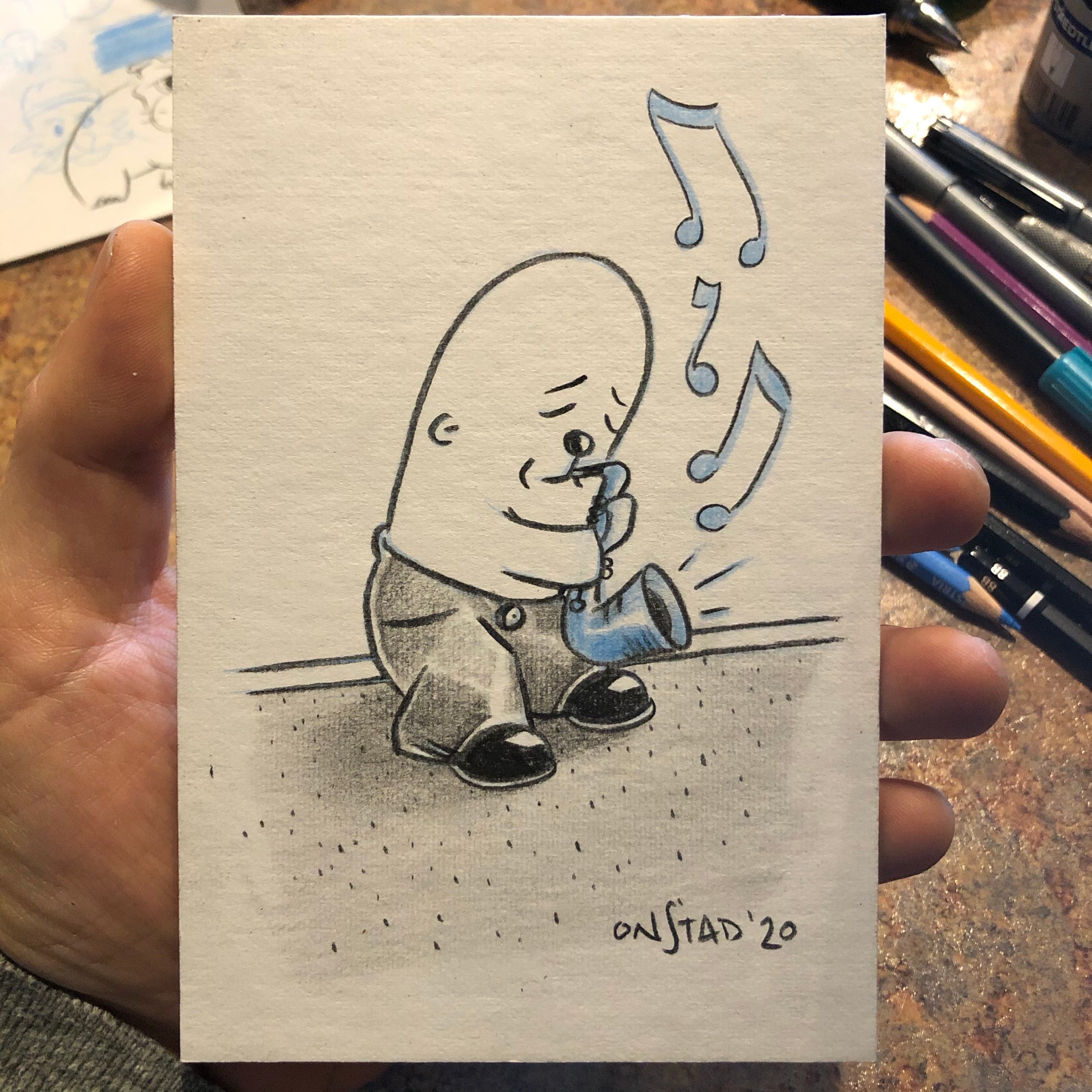 He’s just in the hall, but he is pretending it is a nightclub called The Blue Note. 4x6” pencils on stiff white paperboard.