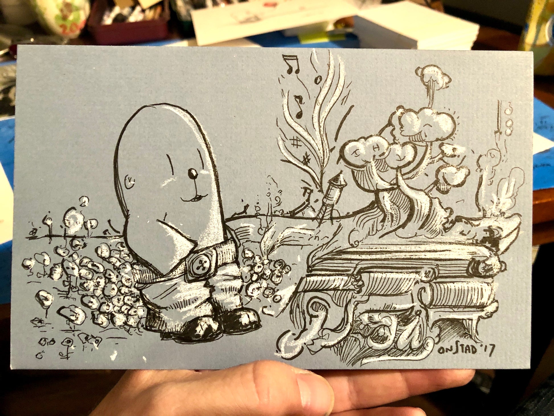 Rejected* by the Library of Congress as the signature illustration for the 2017 Summer Reading Program, here we see Philippe encountering what seems to be a magical tome or grimoire on a curious pedestal in the middle of an effervescent landscape. 5" x 8", Micron pen and white pencil on thick 1/16" paperboard. Dated 2017.