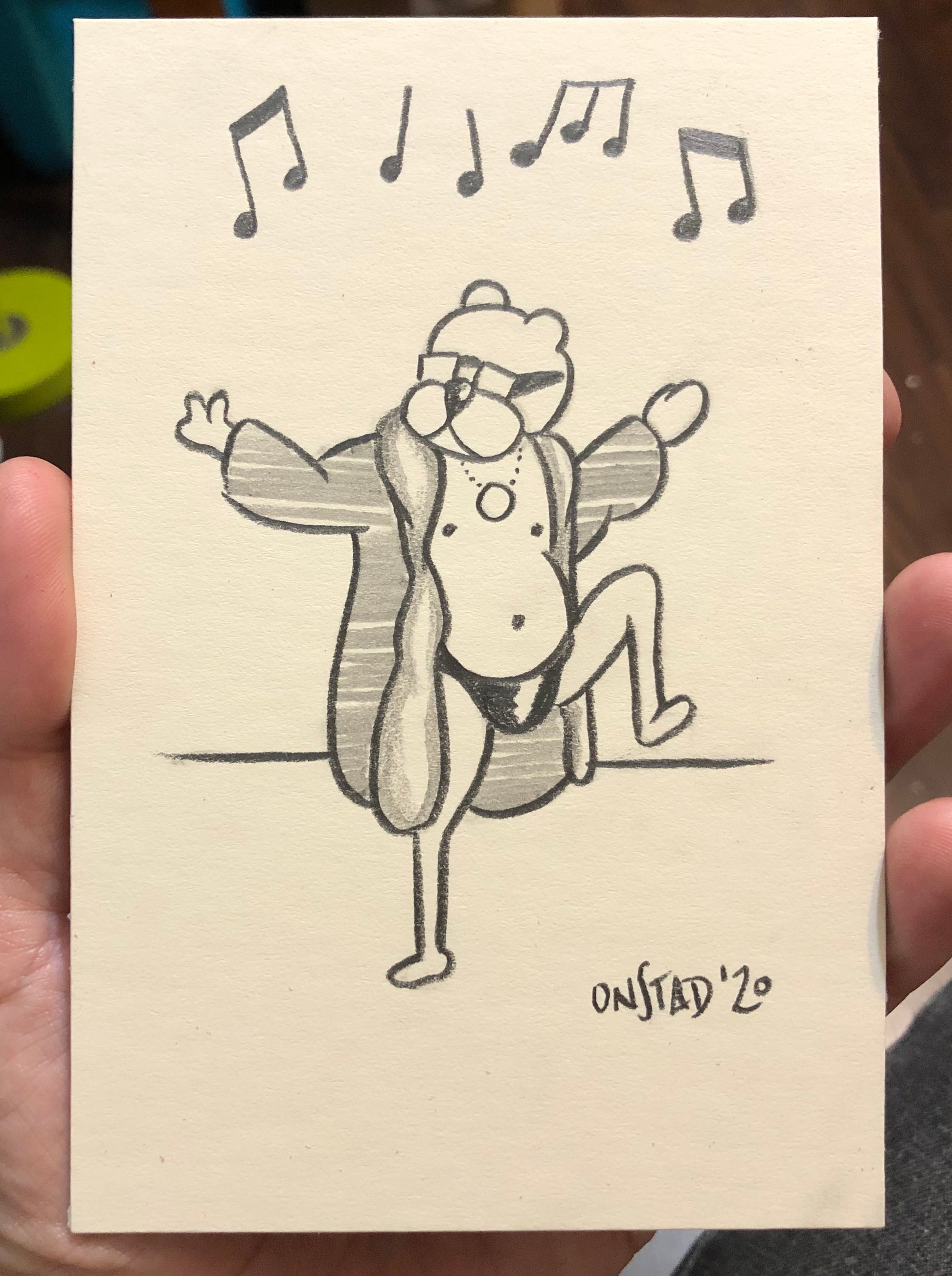 This is the panel that prompted Toto to write Africa, knowing that someday this cat would dance this way to their masterpiece. 4x6” pencils on stiff white paperboard.