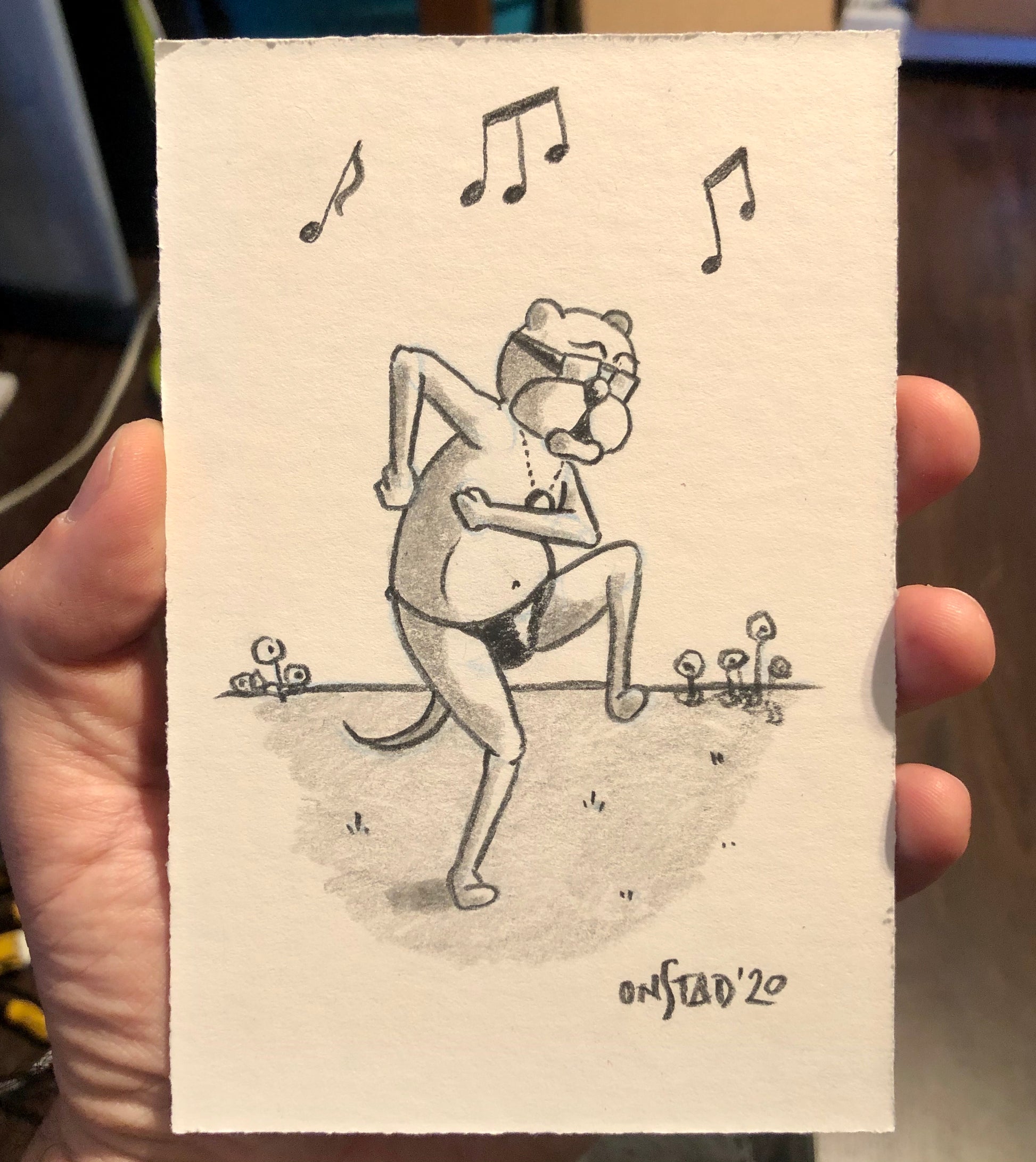 You think Ray can't throw down hard wherever he stands? Get your wrong brain ready for moves both insane and delicious. Because this cat is Hard in the Yard. 4x6” pencils on stiff white paperboard.