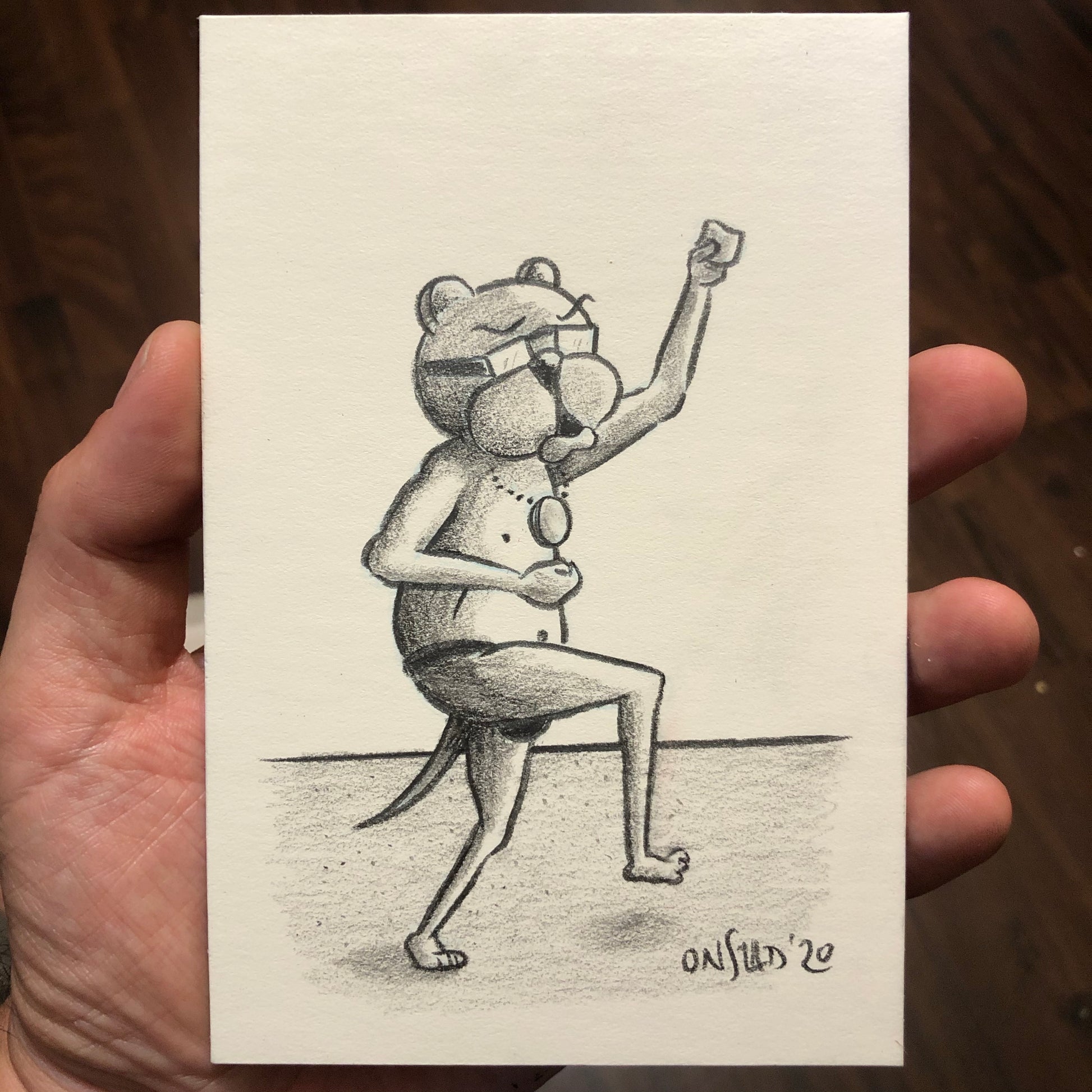 This is how Ray walks to Taco Bell. He doesn't put on his Photo by Karl Lagerfeld when he makes this trip because he doesn't want to smell cologne over the Mexican Pizza and Thai-Style Carnitas Chalupa (from the secret menu, password entropy9 required). 4x6” pencils on stiff white paperboard.