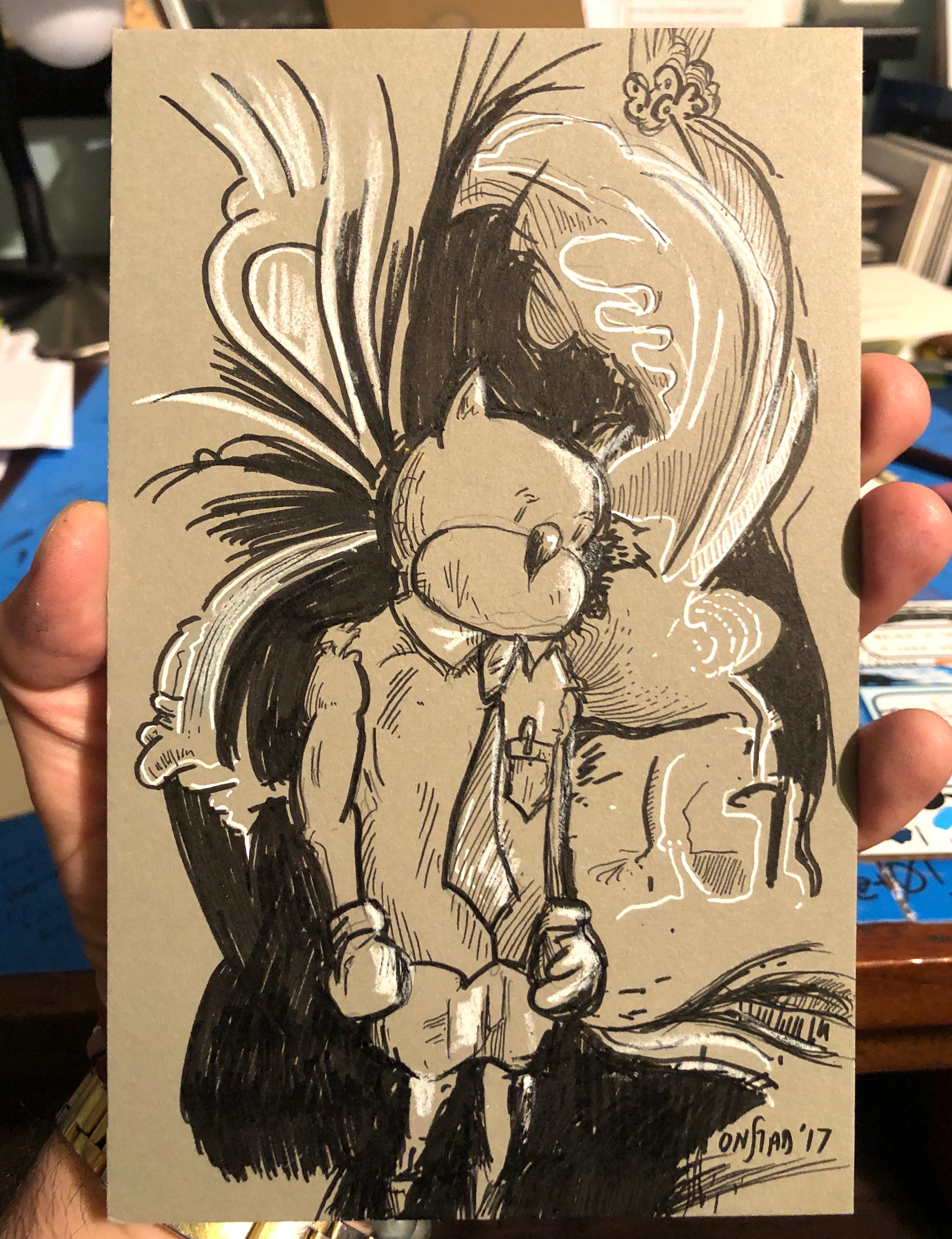 Roast Beef Kazenzakis fights whether he is still, whether he is in motion. Not all fights can be seen, not all victors are proud, not all neckties are tacit admission of defeat. 5.125" x 8", Micron pen and white pencil on thick 1/16" paperboard. Dated 2017.