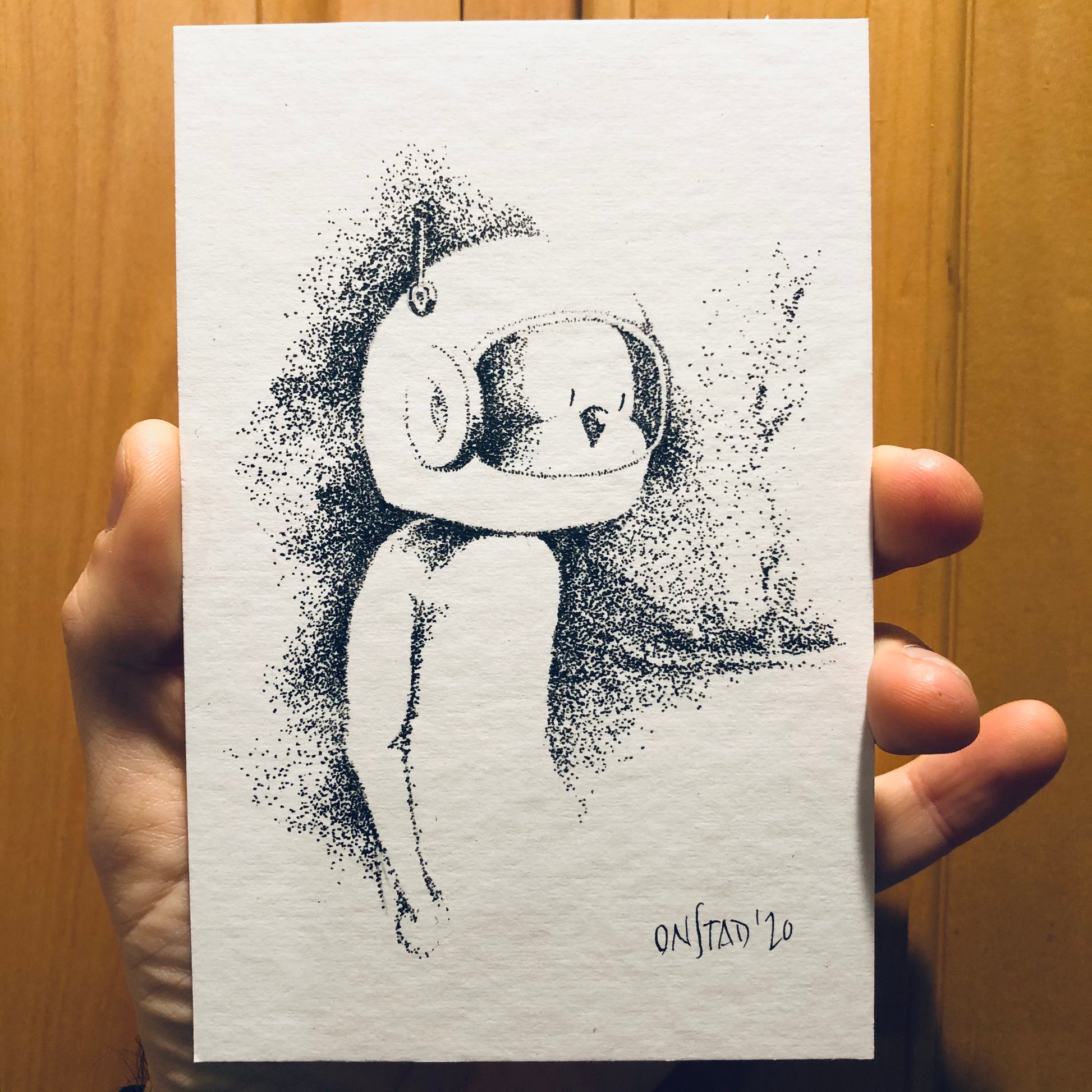Our man Roast Beef patrols the galaxy -- particularly the earth -- and may or may not have Dead Kennedys playing inside his helmet. 4x6” stippled ink on stiff white paperboard.