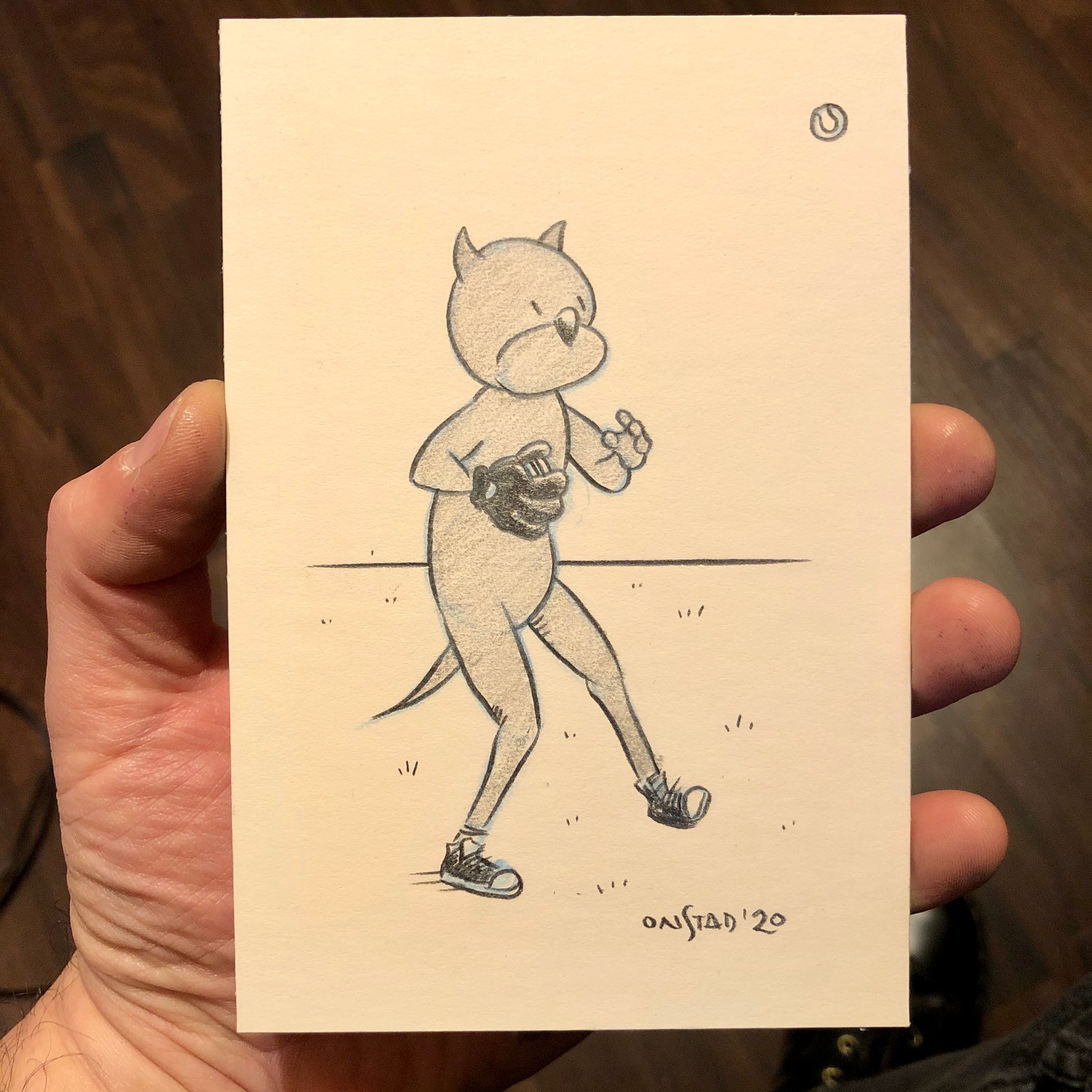 Never confident in his depth perception, yet still a fan of the sport, this is the time Roast Beef was approached by a baseball. Hand-drawn original. 4x6” graphite pencil on stiff white paperboard.