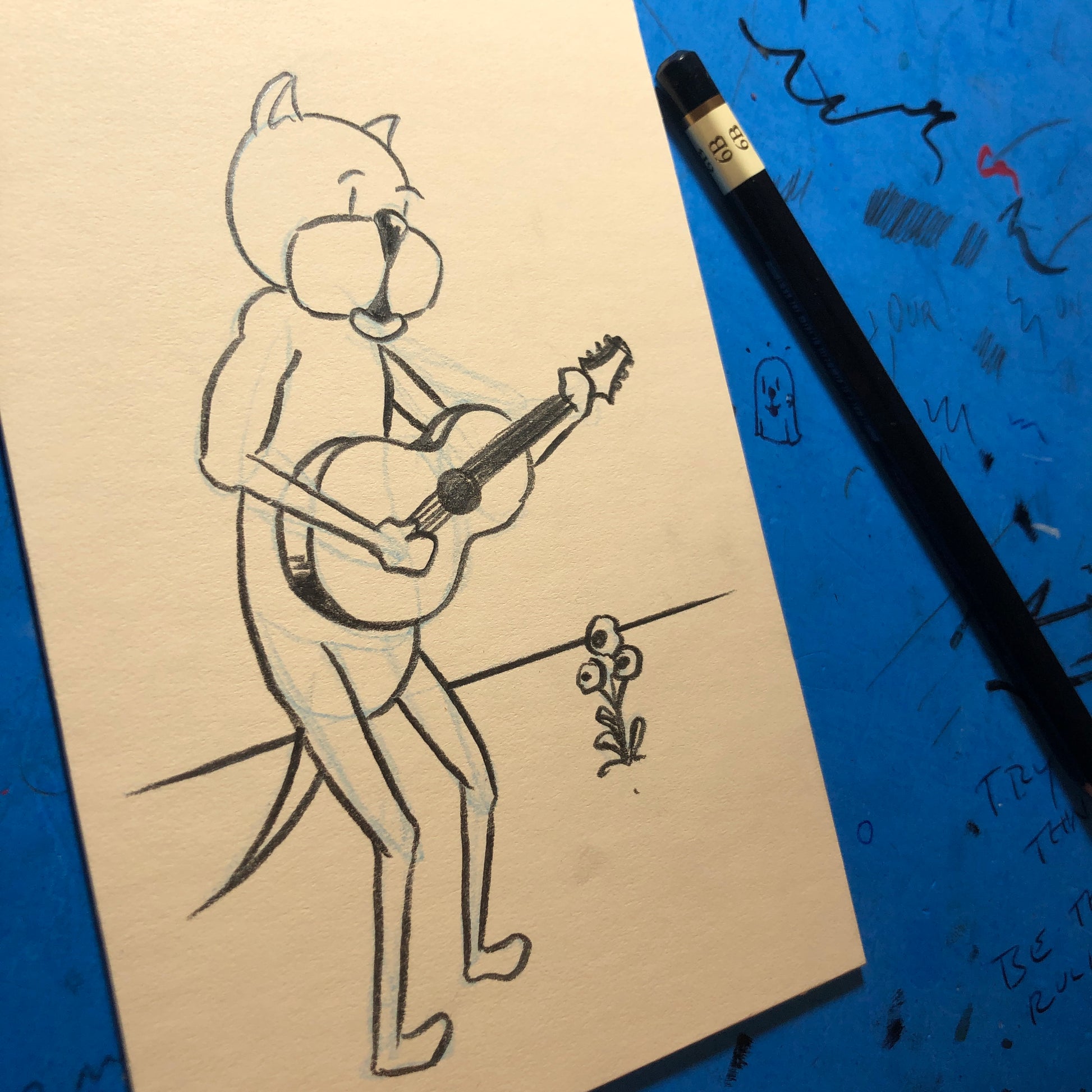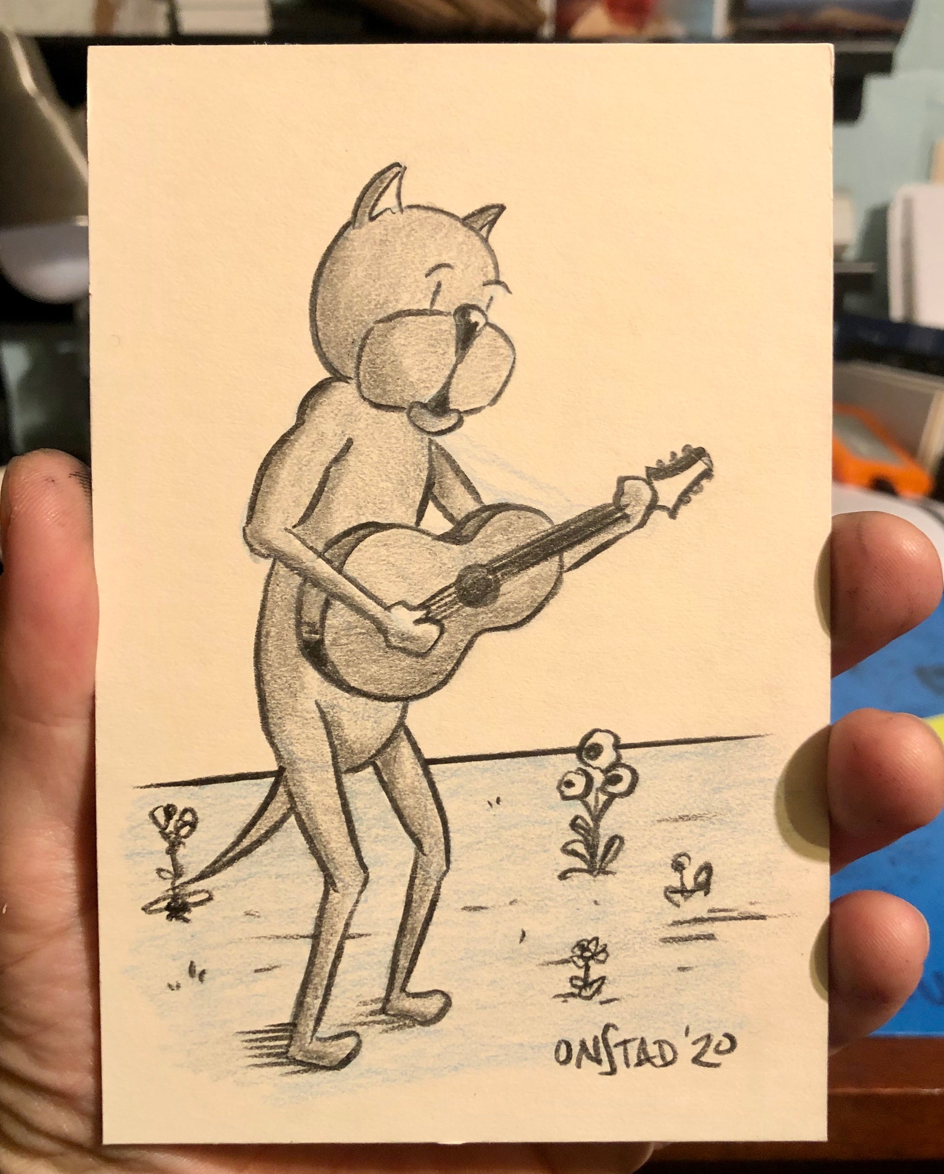 With a boom-chukka in his heart, as natural as day he strums-the-tickas and chickas the brum. 4x6” pencils on stiff white paperboard.