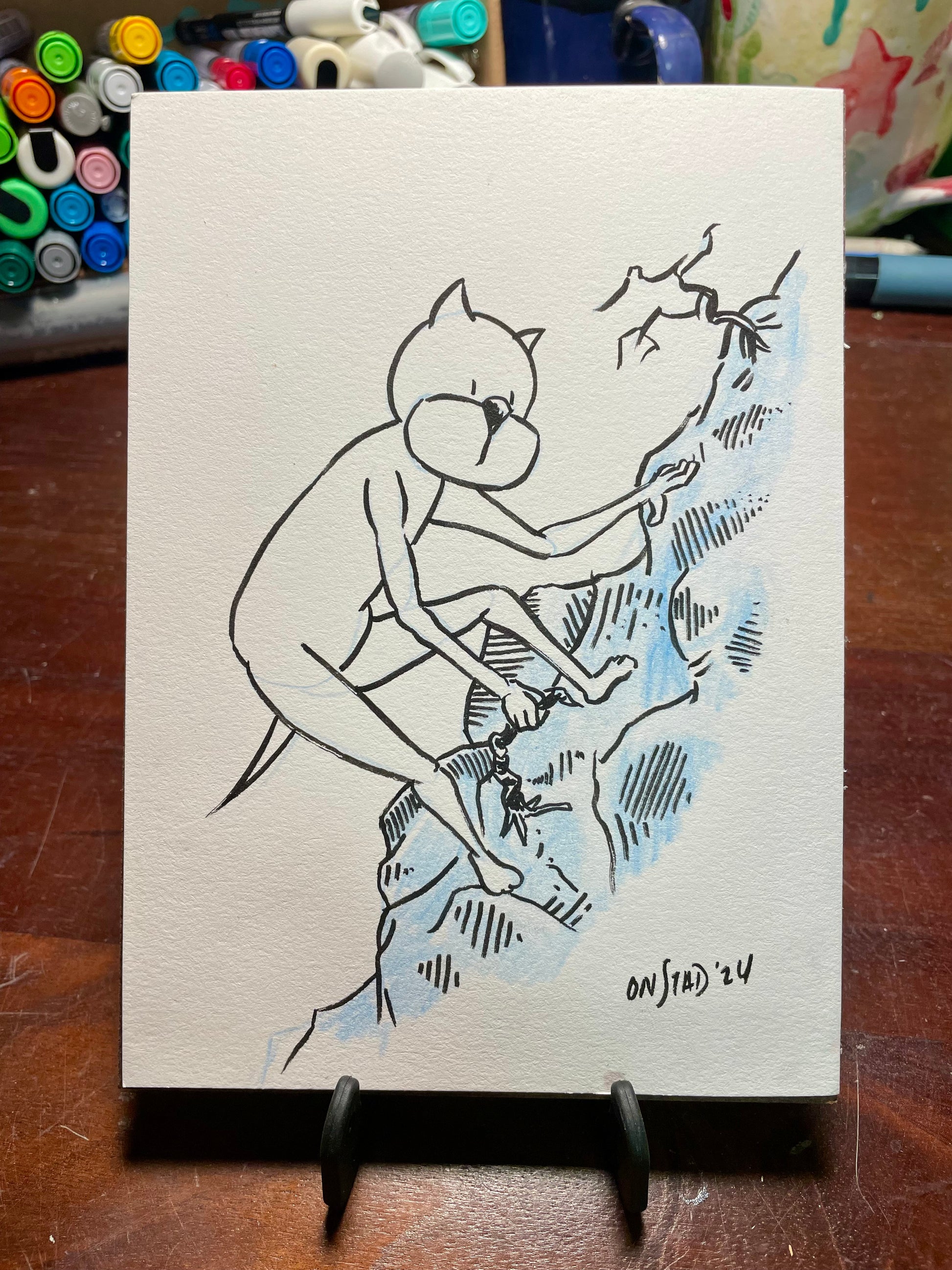 The grade wasn't too too bad, but you could fall, and if you did, you'd tumble a way. There was no easy place for a spine to land. It made you be real present. 5x7", pen and pencil on thick cream paper stock.