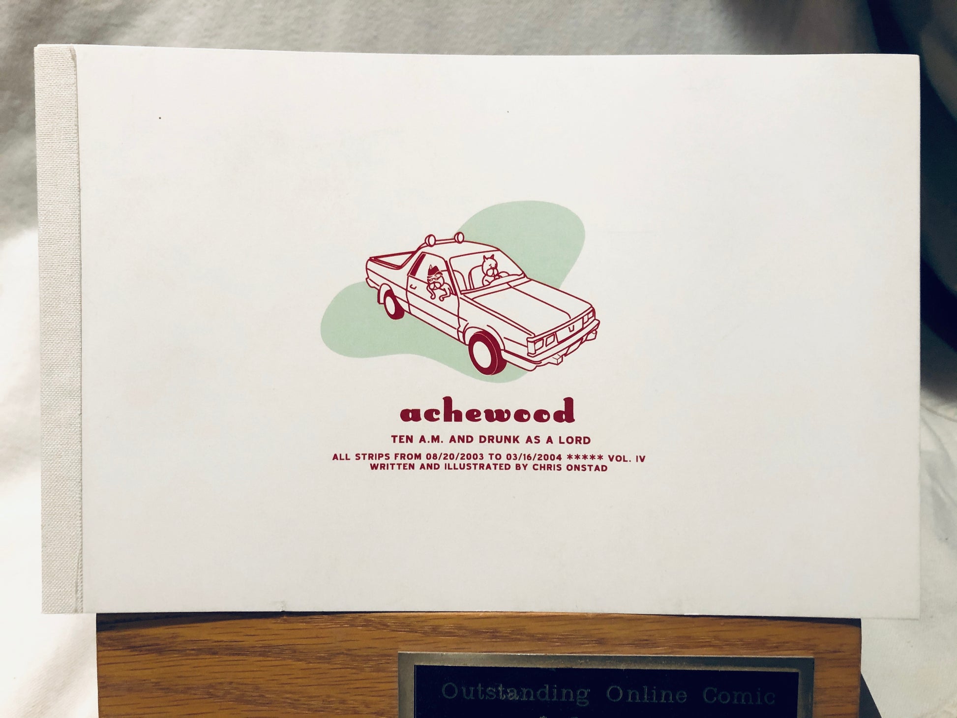 Back in the early days, we self-published all our comics in these tidy little bound volumes. This 140+ page Vol IV., Ten A.M. and Drunk As a Lord, containing all strips from 8/20/2003 - 3/16/2004, also features: a page of classifieds from an Achewood newspaper; a couple rejected comics; A two-page story on the origin of Achewood; and a recipe for an extremely cold salad, by Ray. These particular MINT ORIGINAL CONDITION editions of Volume Four were printed before 2009 and stored sealed in plastic. There are only three of these left anywhere. Please do not delay in ordering if interested. Please indicate in the Notes field if you would like your copy signed.