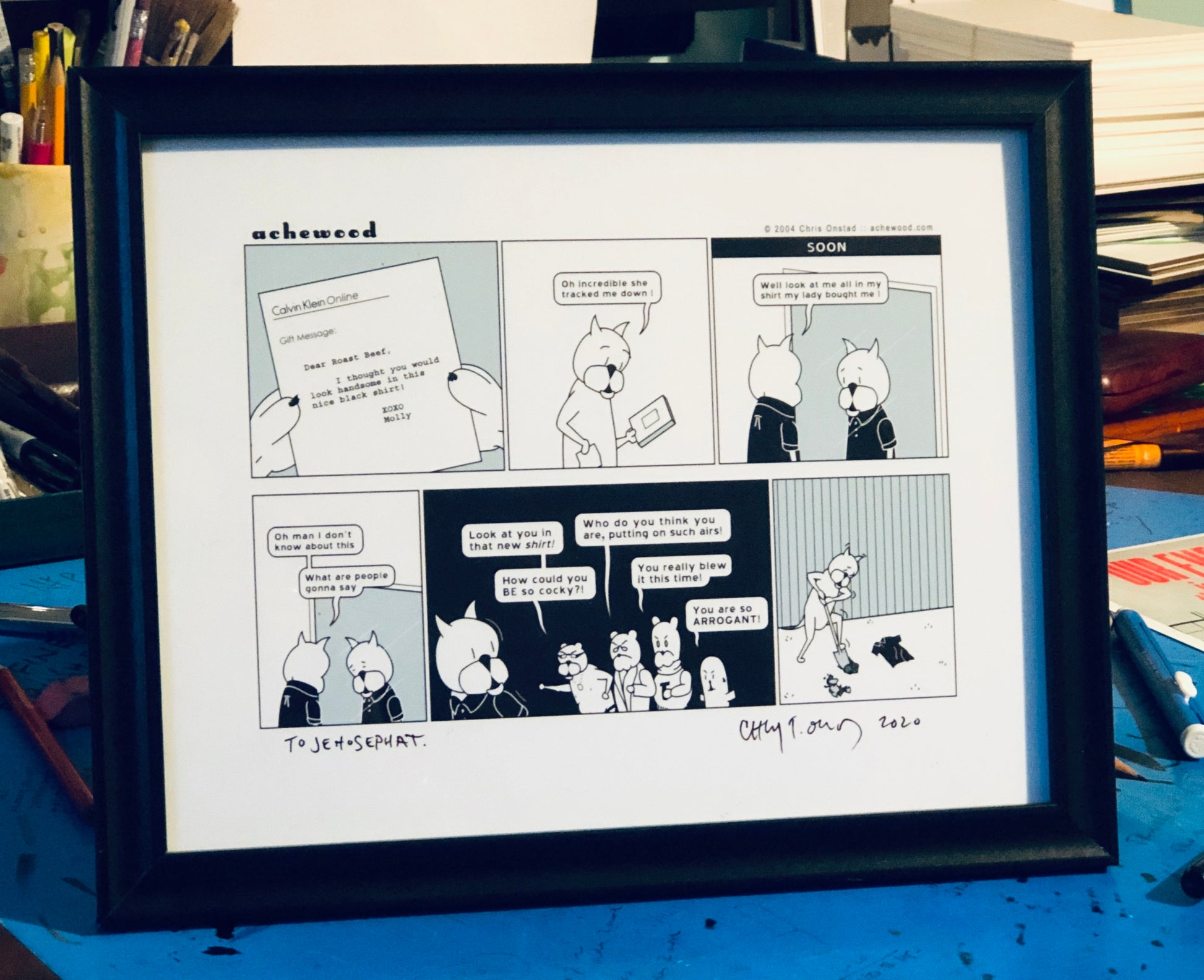 You're about to order a crisp, glossy comic strip reproduction of your choice, printed and signed by me, Chris Onstad, just for you!