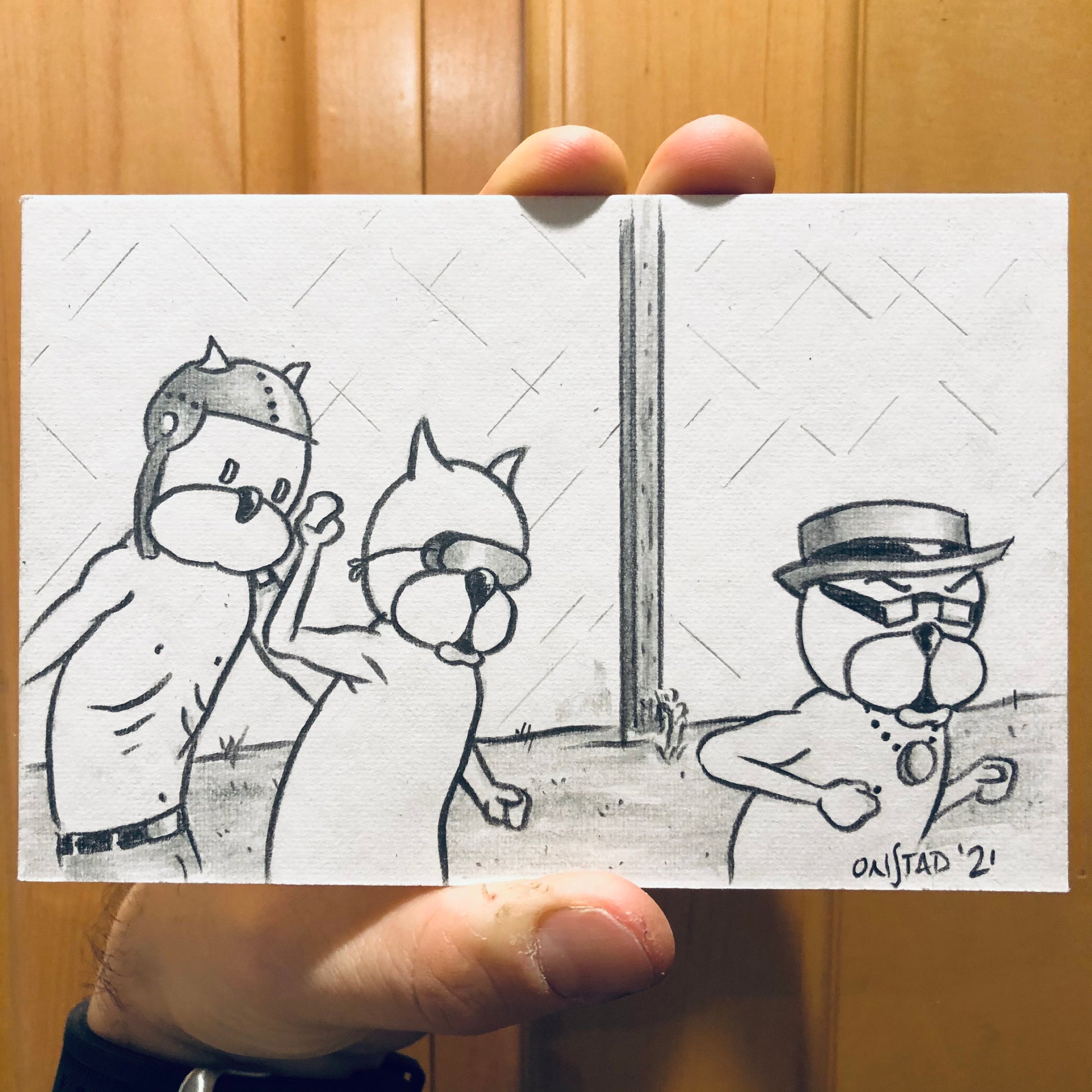 Leander, Beef, and Ray, when it all began. 4x6” pencils on stiff white paperboard.