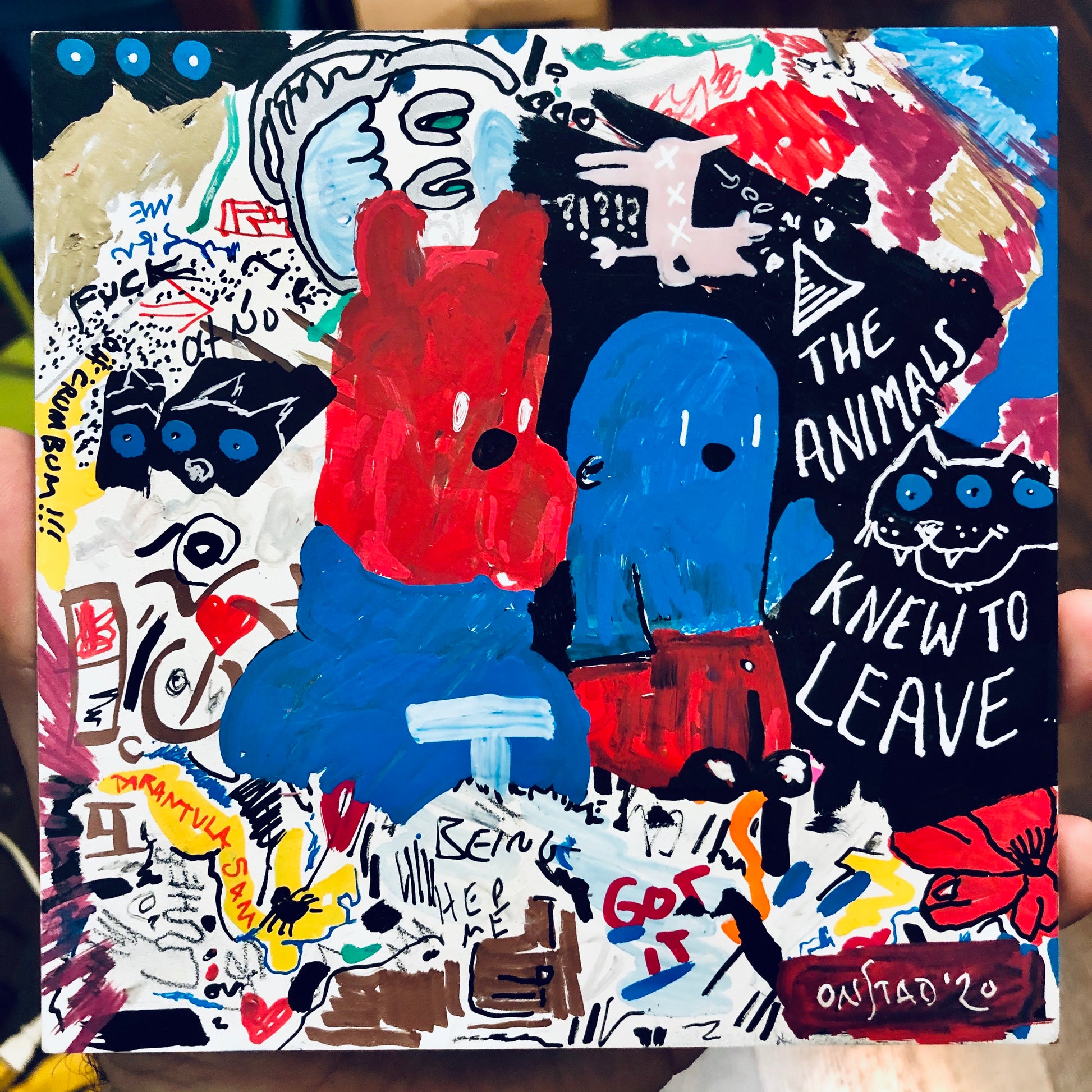 Ahead of the moss and lichen-covered bones, the animals pack their trunks and silently migrate, without thought or complaint, to another place. 6” x 6” multimedia on bright white gesso hardboard.